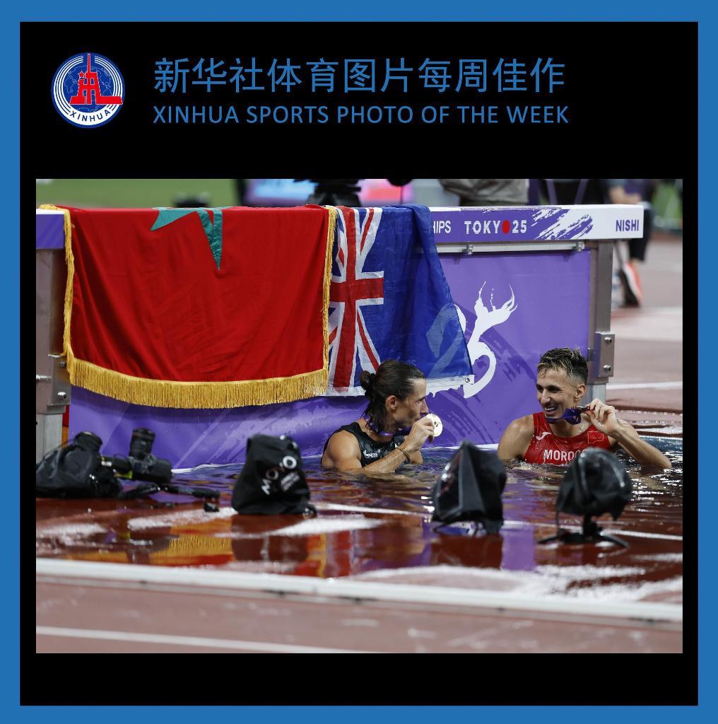 9月15日,冠军新西兰选手比米什(左)和亚军摩洛哥选手艾尔巴卡里在赛后跳进水池庆祝。