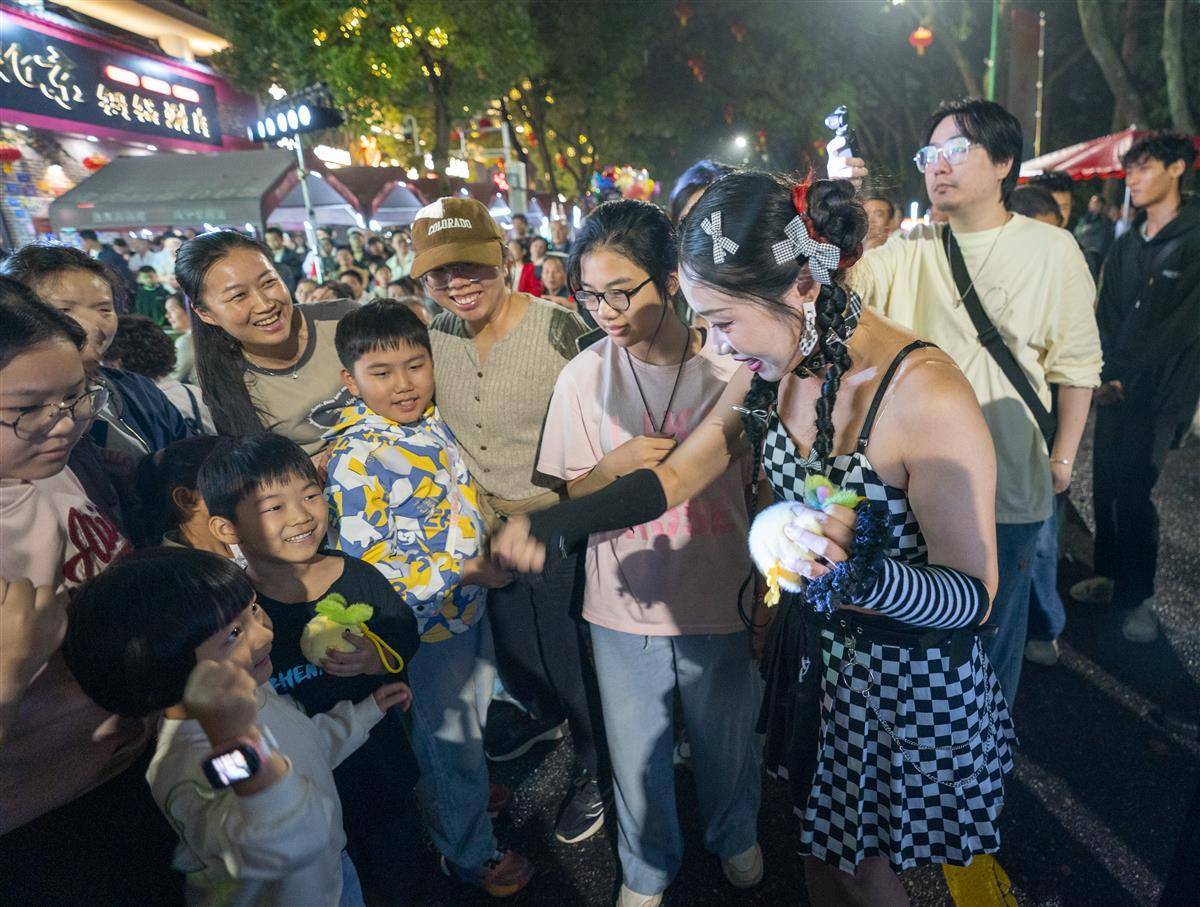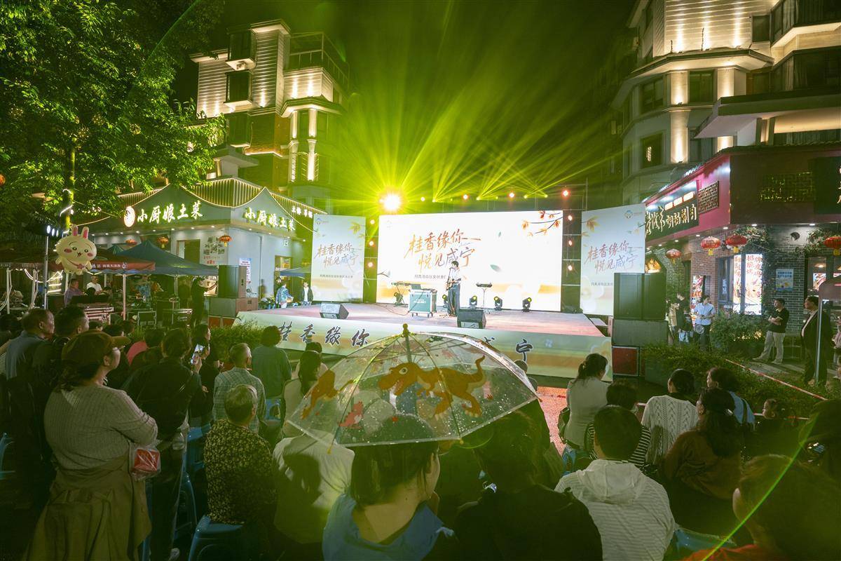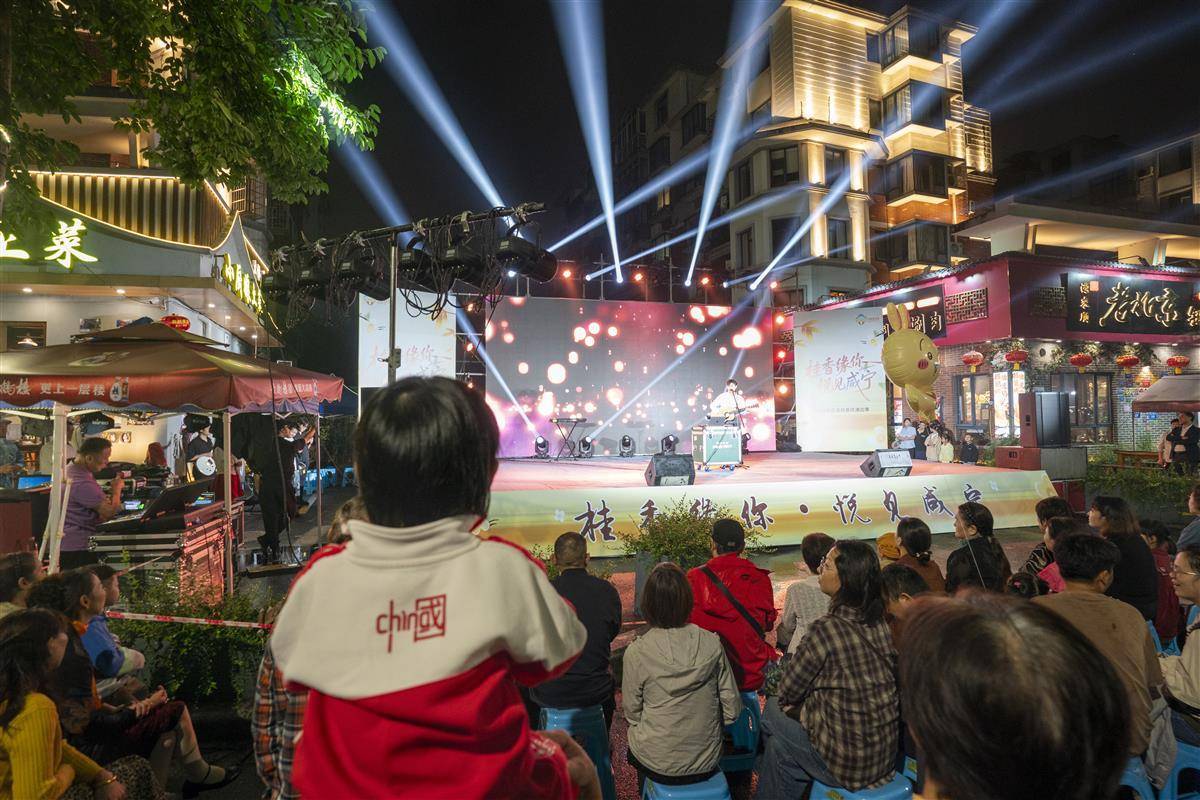 9月21日,咸宁市月亮湾特色街区,市民、游客们欣赏文艺表演、品尝美食。2023年春天,月亮湾主街道被纳入升级改造范围。沿街商户们成立了月亮湾商户自治委员会,号召大家诚信待客,共做“一桌席”。如今,这里已经成为咸宁最具特色的打卡地标。今年以来,咸宁市商务系统紧抓“诚信兴商”这一主线,以信用建设促进消费复苏、释放市场活力,取得了显著成效。今年1至7月,全市社会消费品零售总额511.34亿元,同比增长7.2%,增速位列全省第一,消费市场呈现“供需两旺”的良好态势。(湖北日报全媒记者 魏铼 摄)