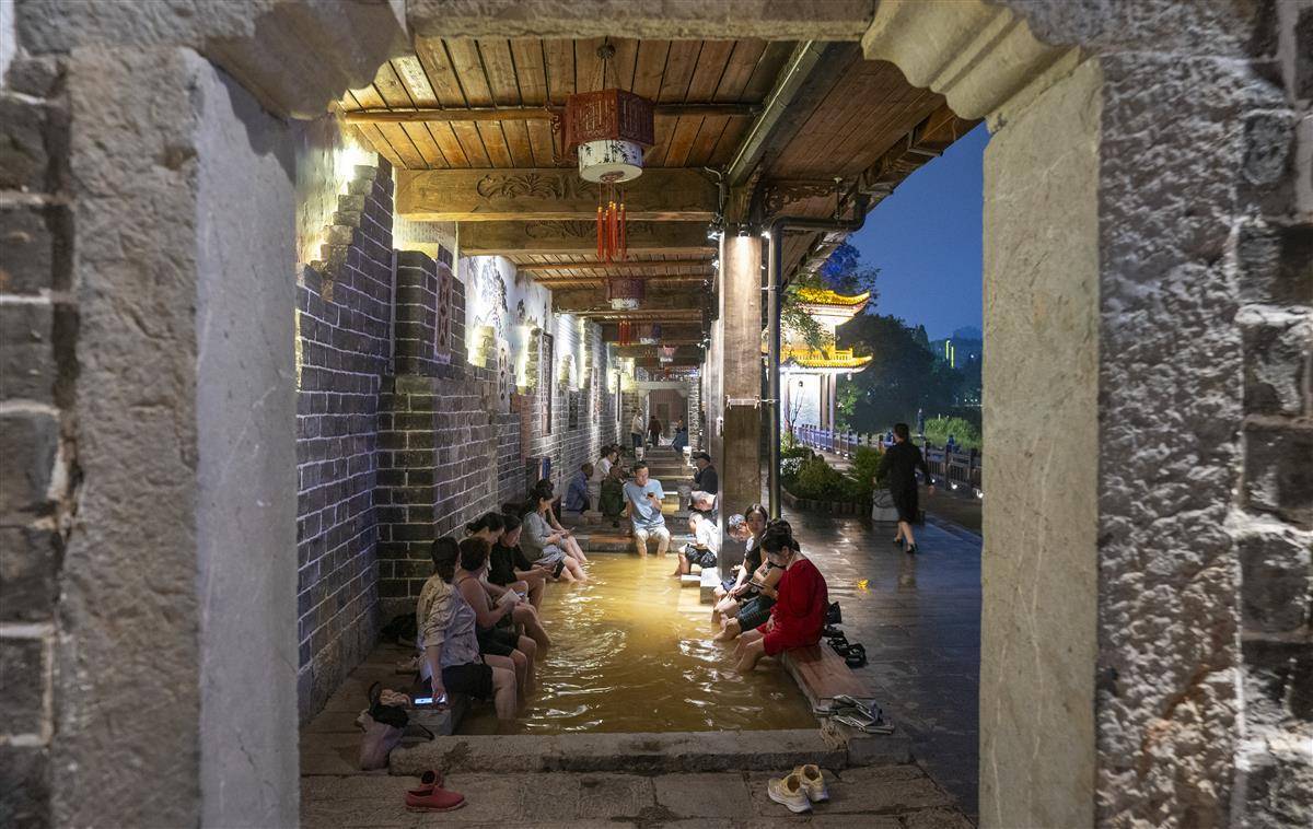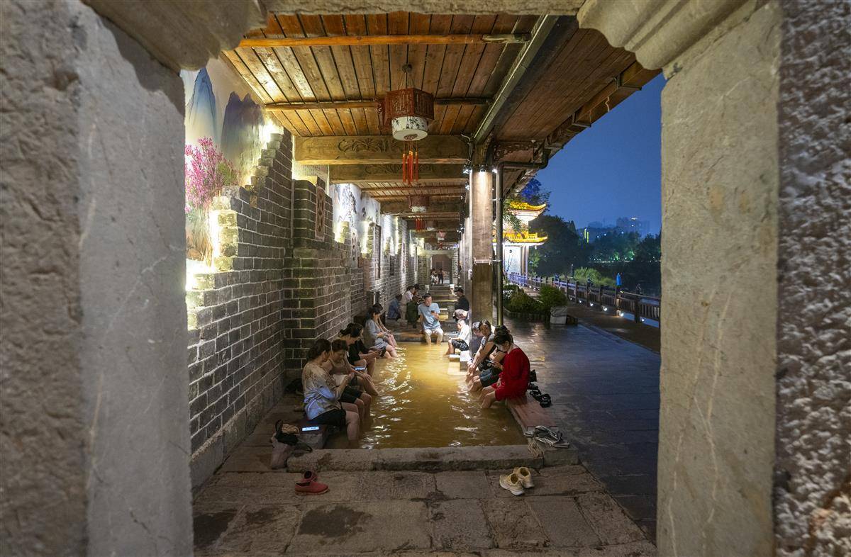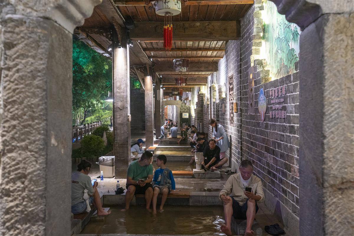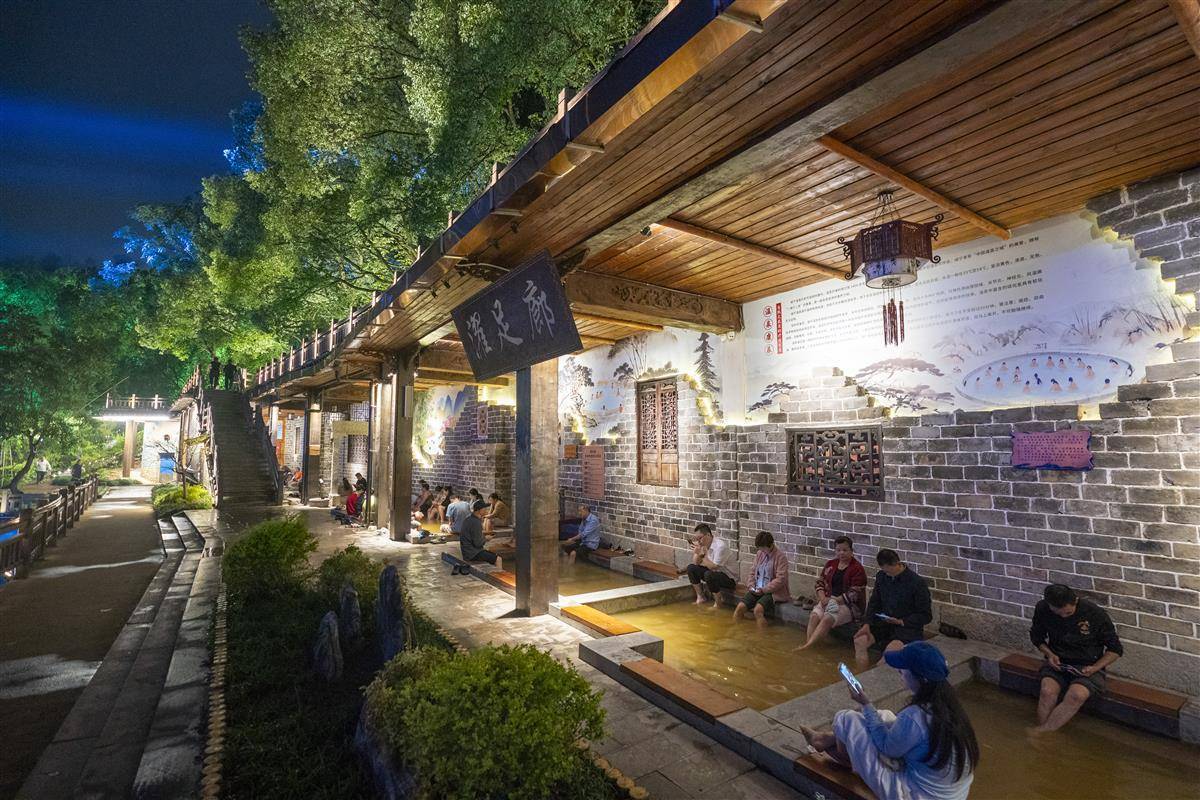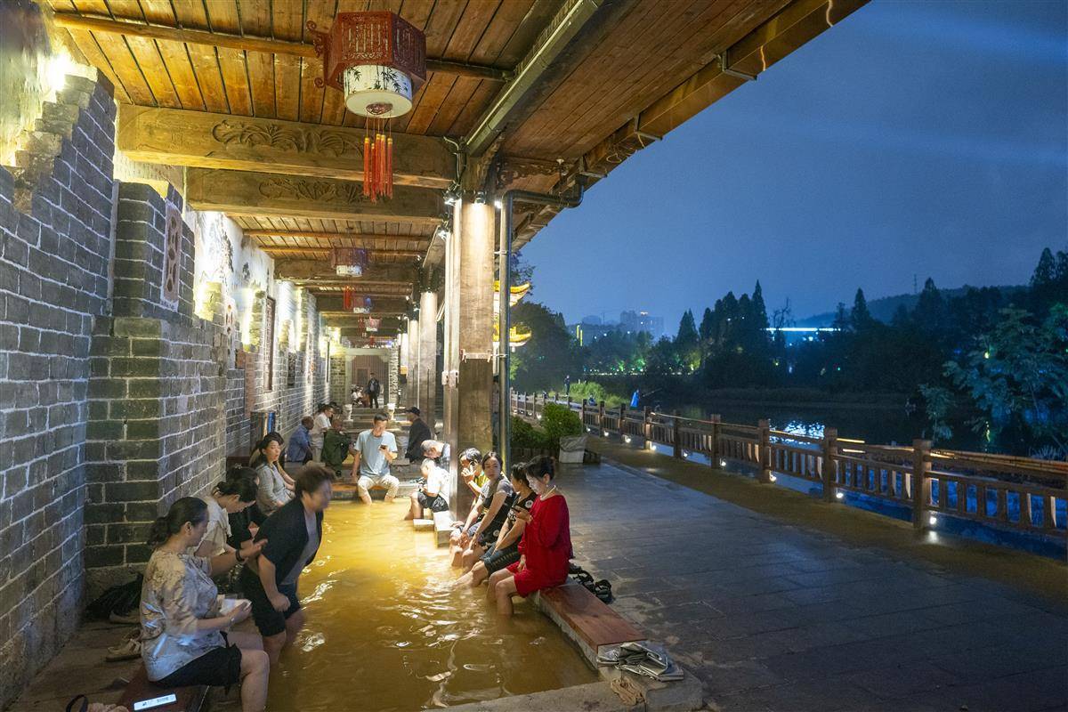 9月21日,夜幕降临,咸宁市淦河月亮湾畔,濯足廊内11个泡脚池内热气蒸腾,市民、游客享受泡脚的惬意,体验温泉康养的乐趣。走进濯足廊,温泉康养的主题壁画、精心设计的青石砖墙、古色古香的木质长廊等设施焕然一新。现场还有秋季免费茶水供应,每晚提供绿茶、酸梅汤、菊花茶等不同茶饮,供市民解渴休憩,每天还有专职工作人员对各个泡脚池进行清洁打扫。今年,当地对濯足廊提档扩容,焕新升级,再次成为游客和市民们休闲游玩的网红打卡地。(湖北日报全媒记者 魏铼 摄)