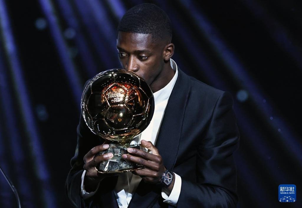 9月22日,巴黎圣日耳曼队法国球员登贝莱在颁奖仪式上与奖杯合影。他获颁男足金球奖。