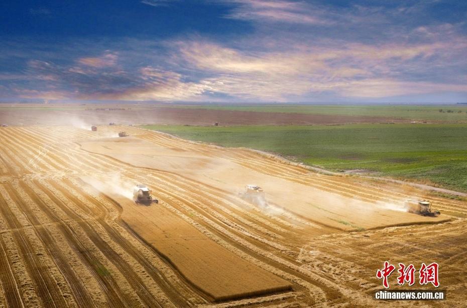 新疆水土光热资源优势显著,盛产棉花、小麦和玉米等50多种高效优质农作物,是中国重要的商品粮、商品棉生产基地。图为新疆生产建设兵团昭苏垦区,一辆辆大型机械穿梭在麦浪翻滚的田野,加紧收割麦子、打捆秸秆,确保粮食颗粒归仓,勾勒出一幅丰收画卷。刘霞 摄
