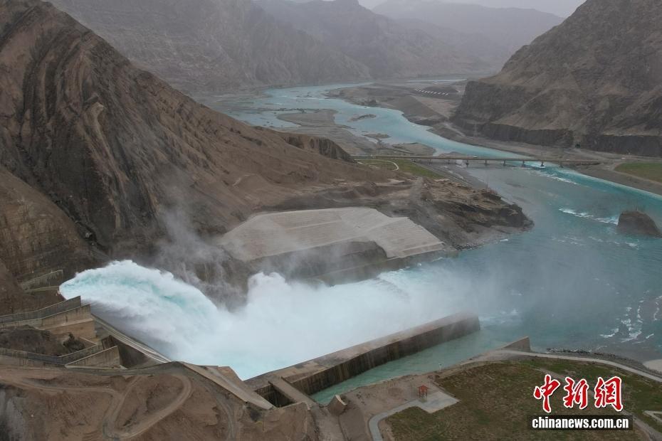 阿尔塔什水利枢纽工程是目前新疆最大的水利工程,是国家“十三五”期间的百项重大工程项目之一,被业内专家称为“新疆的三峡工程”。该工程兼顾发电、防洪、灌溉、生态保护等功能。图为航拍阿尔塔什水利枢纽工程大坝泄洪。(无人机照片)中新社记者 田雨昊 摄