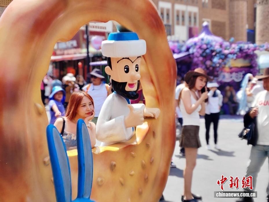 新疆旅游市场持续升温,不少景区已成为游客热门打卡地。图为游客在乌鲁木齐市大巴扎步行街拍照。王小军 摄