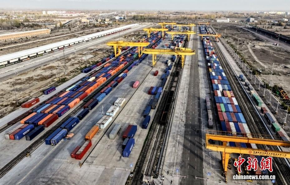 随着我国与共建“一带一路”国家的贸易往来日益紧密,新疆铁路双口岸运输优势日益凸显。图为霍尔果斯铁路口岸有序排列的集装箱。(无人机照片)中新网记者 刘新 摄
