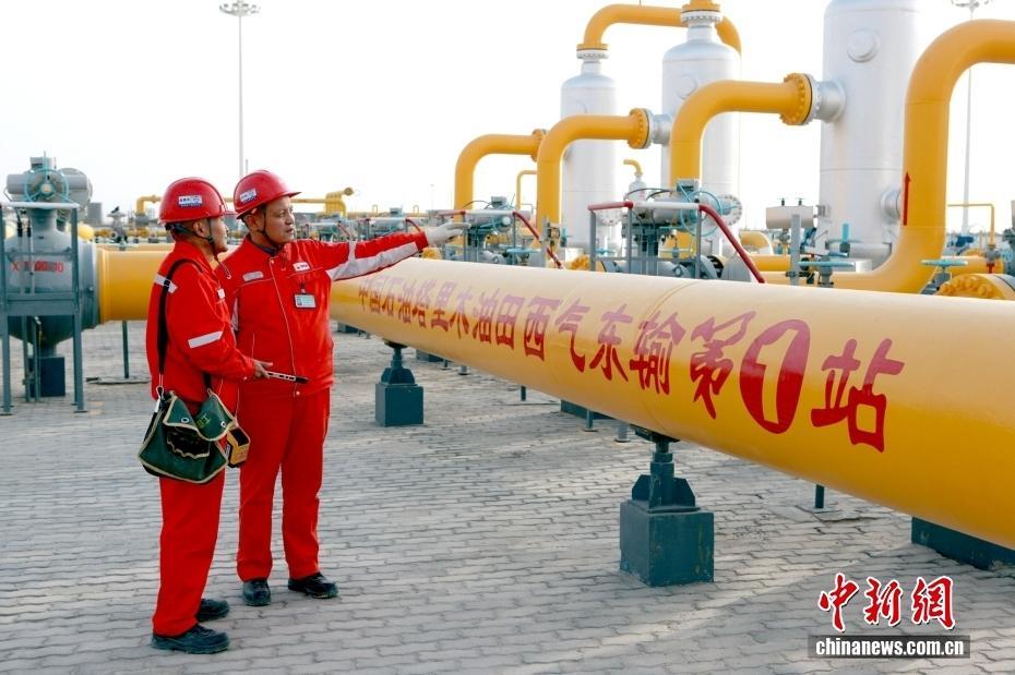 西气东输第一站位于新疆轮台县轮南镇,是塔里木油田西气东输工程起点,被誉为塔里木油田的“心脏”。图为西气东输第一站员工巡视装置,保障天然气供应。苏华 摄