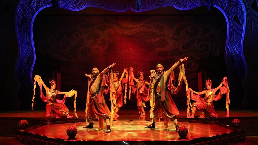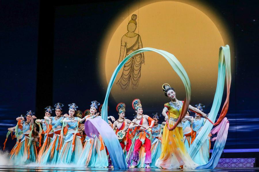 Artists perform classic dance drama "Flower Rains Along Silk Road" in Dunhuang, northwest China's Gansu Province, Sept. 20, 2025. (Xinhua/Lang Bingbing)