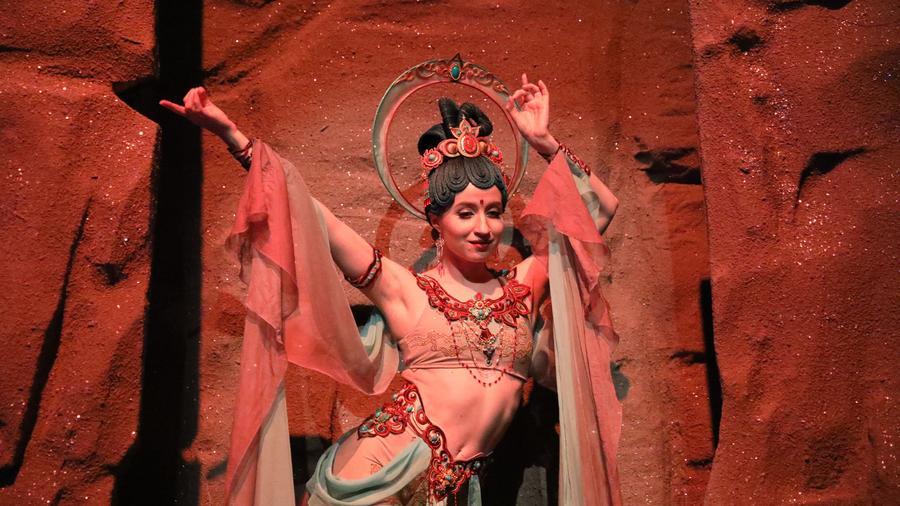 This undated photo shows Romanovych Inna performing the dance drama "Ancient Sound of Dunhuang" in Dunhuang, northwest China's Gansu Province. (Gansu Performance Group/Handout via Xinhua)
