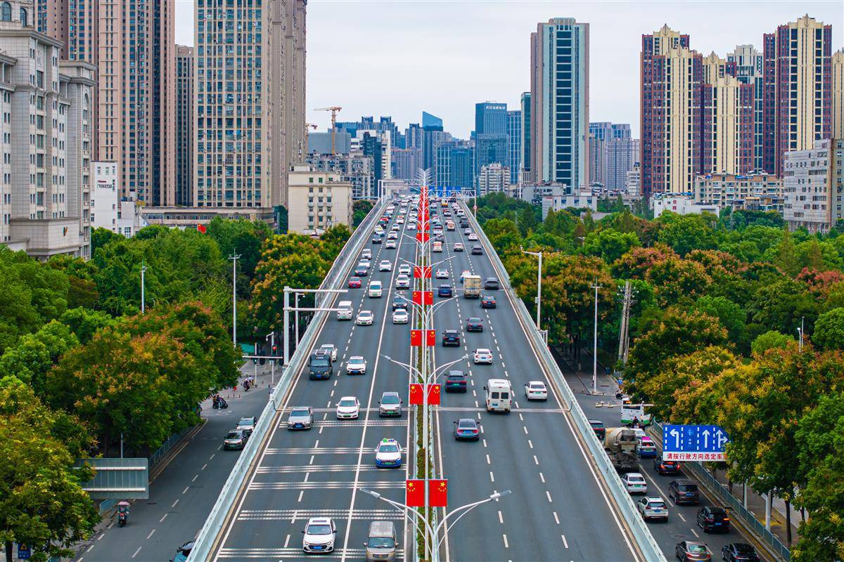 9月23日,数百面国旗悬挂在武汉市常青大道高架道路中央,一抹抹鲜艳的中国红为即将到来的国庆佳节增添了喜庆的节日氛围,形成了一道亮丽的风景线。(湖北日报全媒记者 任勇 摄)