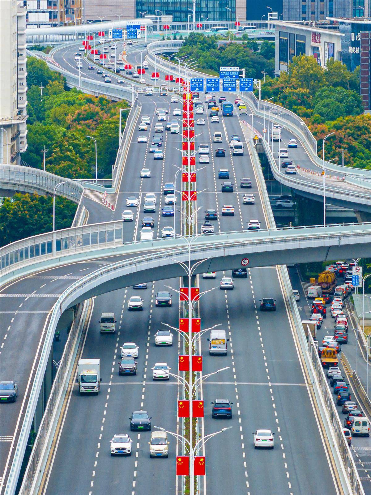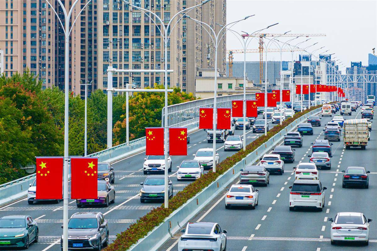 9月23日,数百面国旗悬挂在武汉市常青大道高架道路中央。(湖北日报全媒记者 任勇 摄)