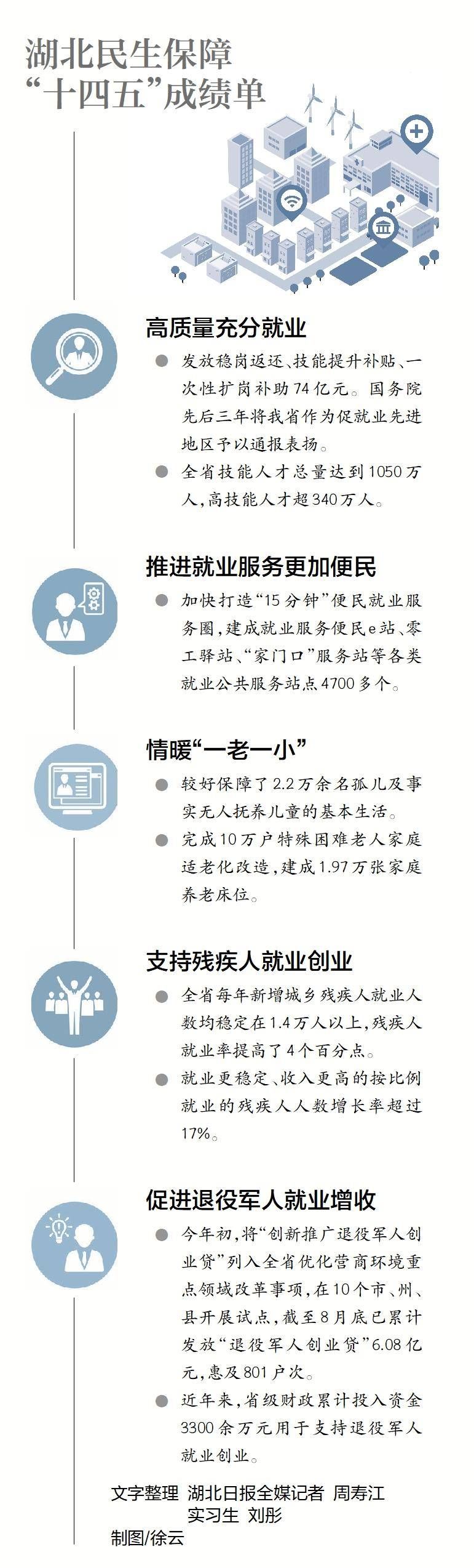 我省把高校毕业生等重点群体就业作为重中之重,深入实施“才聚荆楚”工程,联动举办“百县进百校联万企”、就业大讲堂、求职能力实训营等活动,连续三年吸引超过40万名高校毕业生选择湖北、扎根湖北、建功湖北;加大劳务协作力度,培育壮大特色劳务品牌,农村劳动力转移就业每年保持在1100万人以上,退捕渔民转产就业率100%,零就业家庭动态清零,统筹推进退役军人、残疾人等各类群体就业,实现就业有渠道、增收有路径、生活有保障。