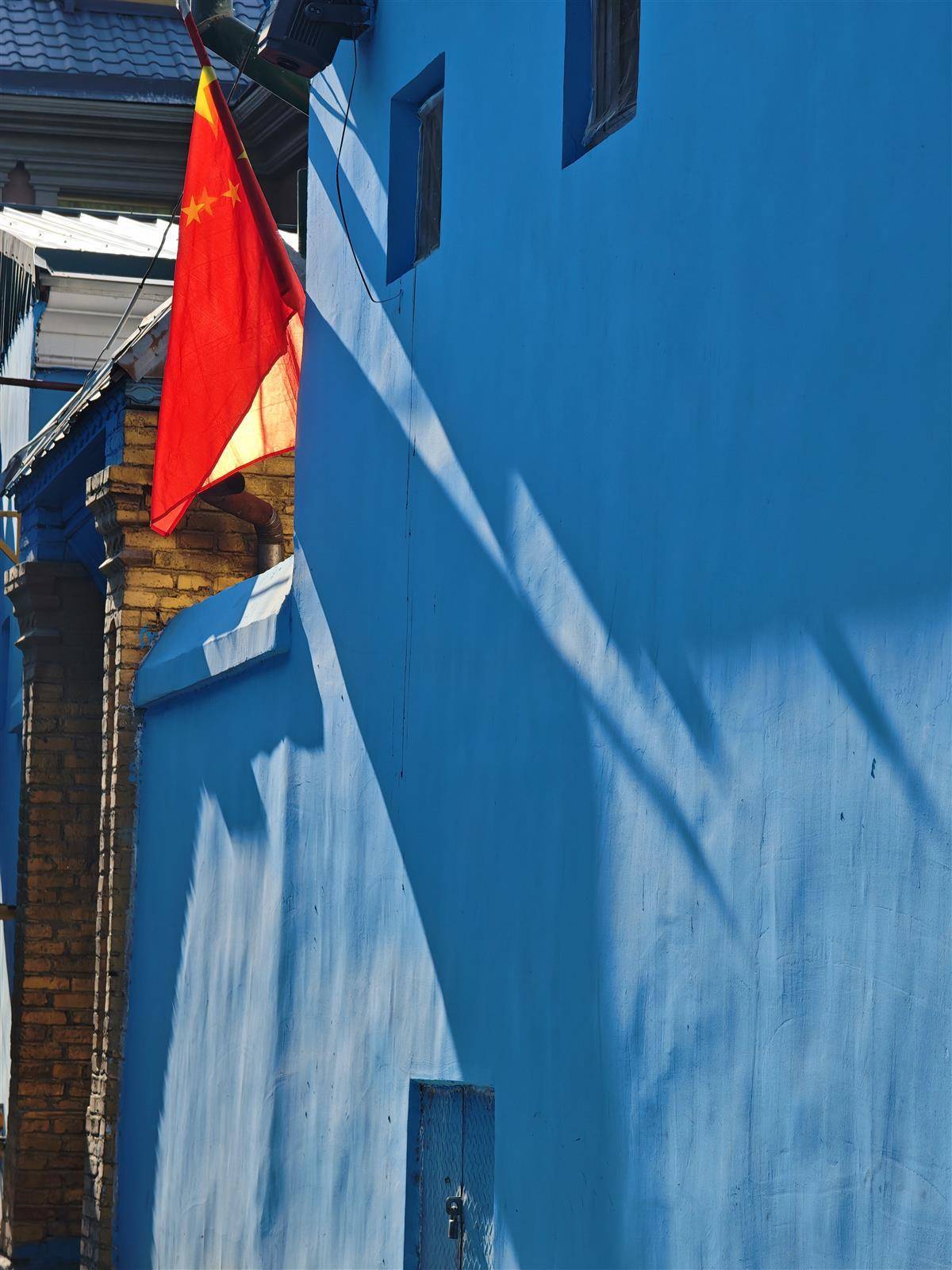 新疆民居,处处可见蓝色的墙面,鲜红的国旗。