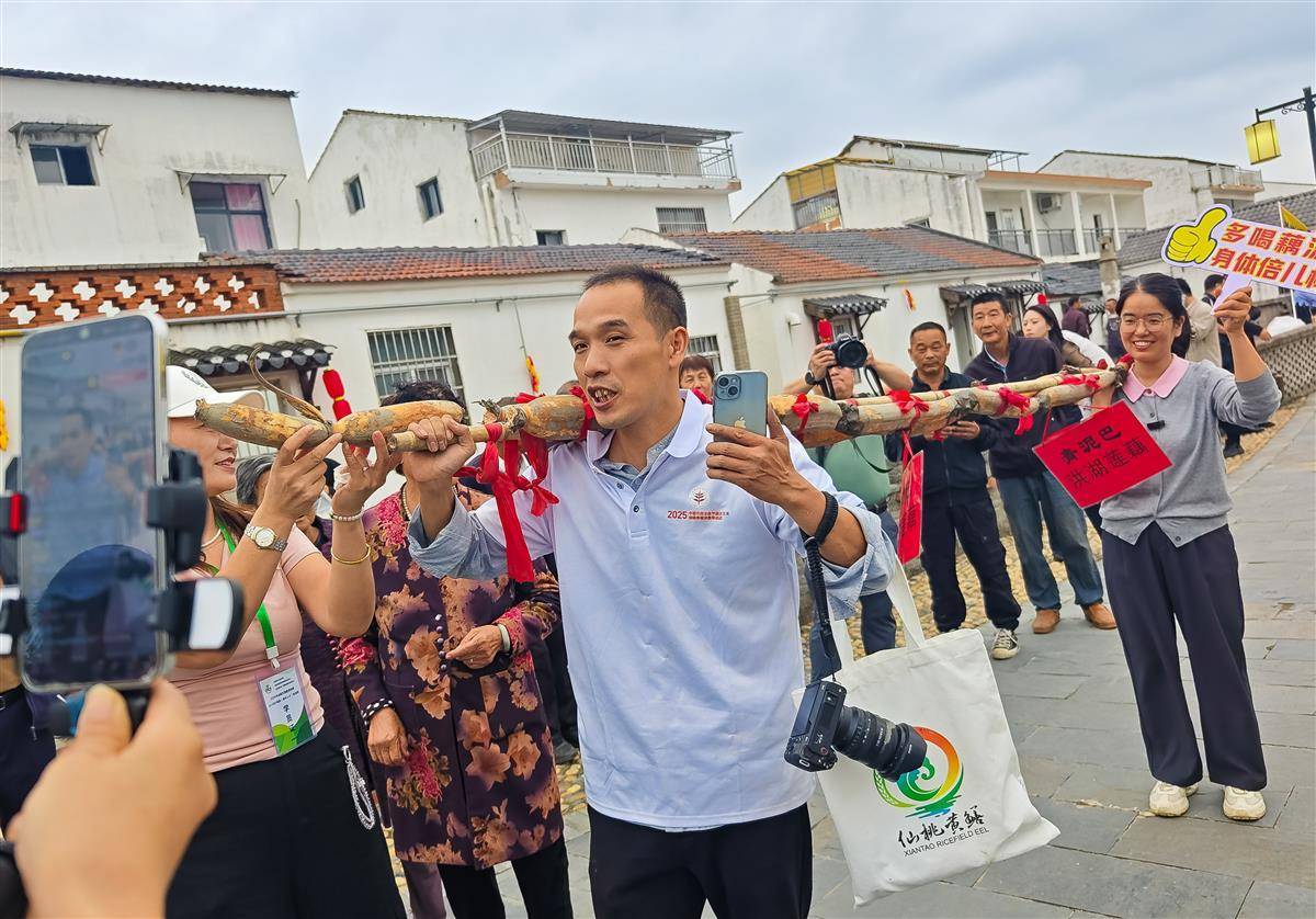 9月23日,2025中国农民丰收节湖北主场·仙桃黄鳝消费季活动在仙桃市排湖密塘渔村隆重举行。来自洪湖青泥巴莲藕合作社的藕农带来3米多长的莲藕,引得现场观众伸手触摸,沾好运。(湖北日报全媒记者 柯皓 摄)