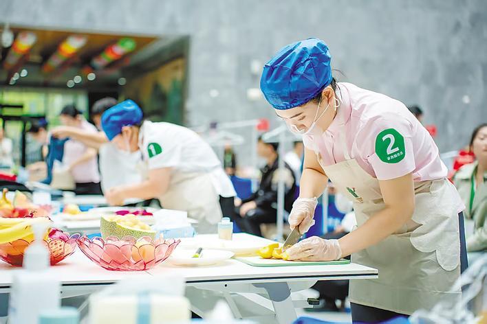 9月19日,孝感市巾帼家政服务职业技能大赛在孝昌县文化中心举行,来自该市各地的11支代表队、66名参赛选手齐聚赛场,围绕养老护理员、母婴护理员、家政服务员三大核心项目展开角逐,充分展现了新时代家政从业者的专业素养与职业风采。图为选手们在比赛厨艺。 (湖北日报通讯员 王婧瑜 摄)