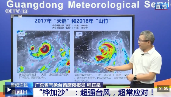 程正泉:2017年的“天鸽”和2018年的“山竹”都是登陆广东省的强台风,登陆地段非常相似,“天鸽”的个头非常小,但是比较强,登陆的时候是15级,影响主要是在珠江口西侧的几个市县。“山竹”的范围非常庞大,登陆的时候是14级,也是强台风,几乎整个广东省都受到了影响,也给广东省带来了人员伤亡和巨额的财产损失。超强台风“桦加沙”在登陆时候的强度可能会比它们更强,而且范围也会很广,持续时间也会比较长,有可能带来的灾害损失会超过这两个台风。建议受台风严重影响的地区,大家做好安全防护措施,尽量减少不必要的出门,在台风严重影响的时候,要做到人不出门,车不上路,保护好自己和家人的人身和财产安全。