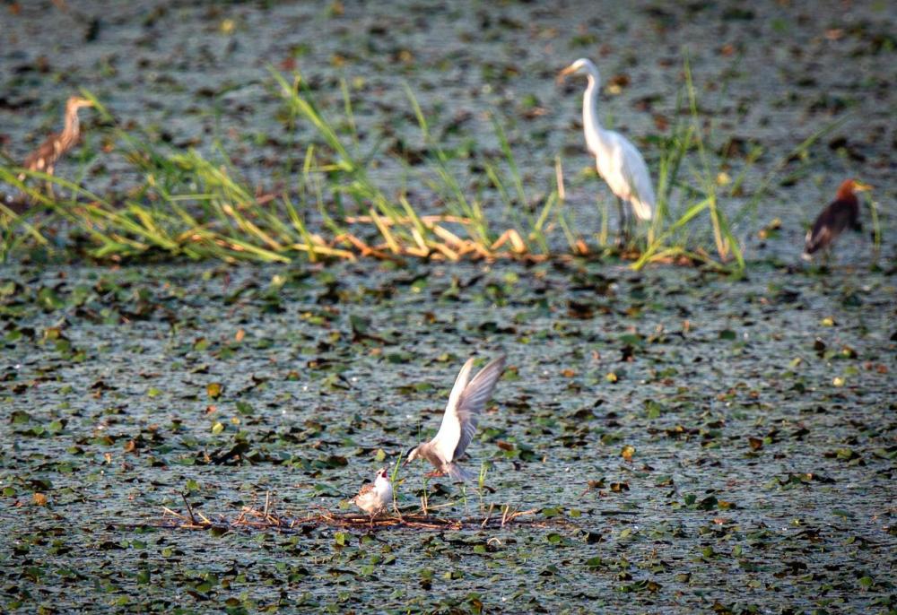 栖息在沉湖湿地的灰翅浮鸥给幼鸟喂食(8月3日摄)。新华社记者 伍志尊 摄