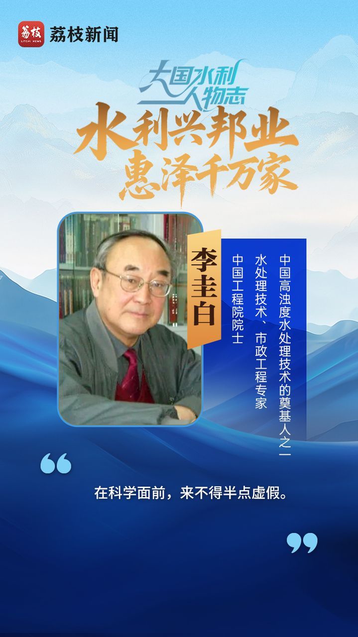 李圭白,中国高浊度水处理技术的奠基人之一。他开发了全新的地下水除铁除锰工艺,在十几年内推广到全国 80%以上的地下水含铁锰水厂,让我国在该技术领域进入世界先进行列。针对水处理中的凝聚和絮凝难题,他带领课题组研制出我国第一台流动电流检测仪,使我国成为第二个掌握该技术的国家。他创新出的高锰酸钾及其化合物工艺,为我国饮用水的污染治理开辟了新的途径。他一直坚持“生命不息,奋斗不止”,60岁做实验,70岁下现场,80岁写文章,90岁出专著,用无尽的热情和智慧勾画着我国水工业发展的宏伟蓝图。