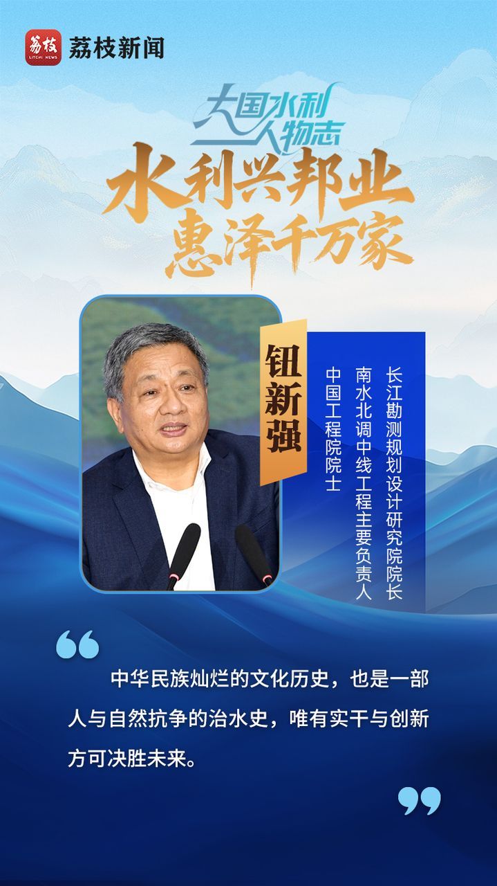 钮新强长期投身长江流域水利工程设计与研究。30余年来,他主导三峡工程、南水北调中线工程、引江补汉工程等国之重器建设。作为南水北调中线工程主要负责人,钮新强主持攻克丹江口大坝加高、穿黄隧洞建设、膨胀土边坡治理等难关,保障了 1432 公里 “水上立交”的落成。中线工程显著改善了京津冀豫等北方地区的水资源短缺状况,保障了沿线数千万人的饮用水安全。