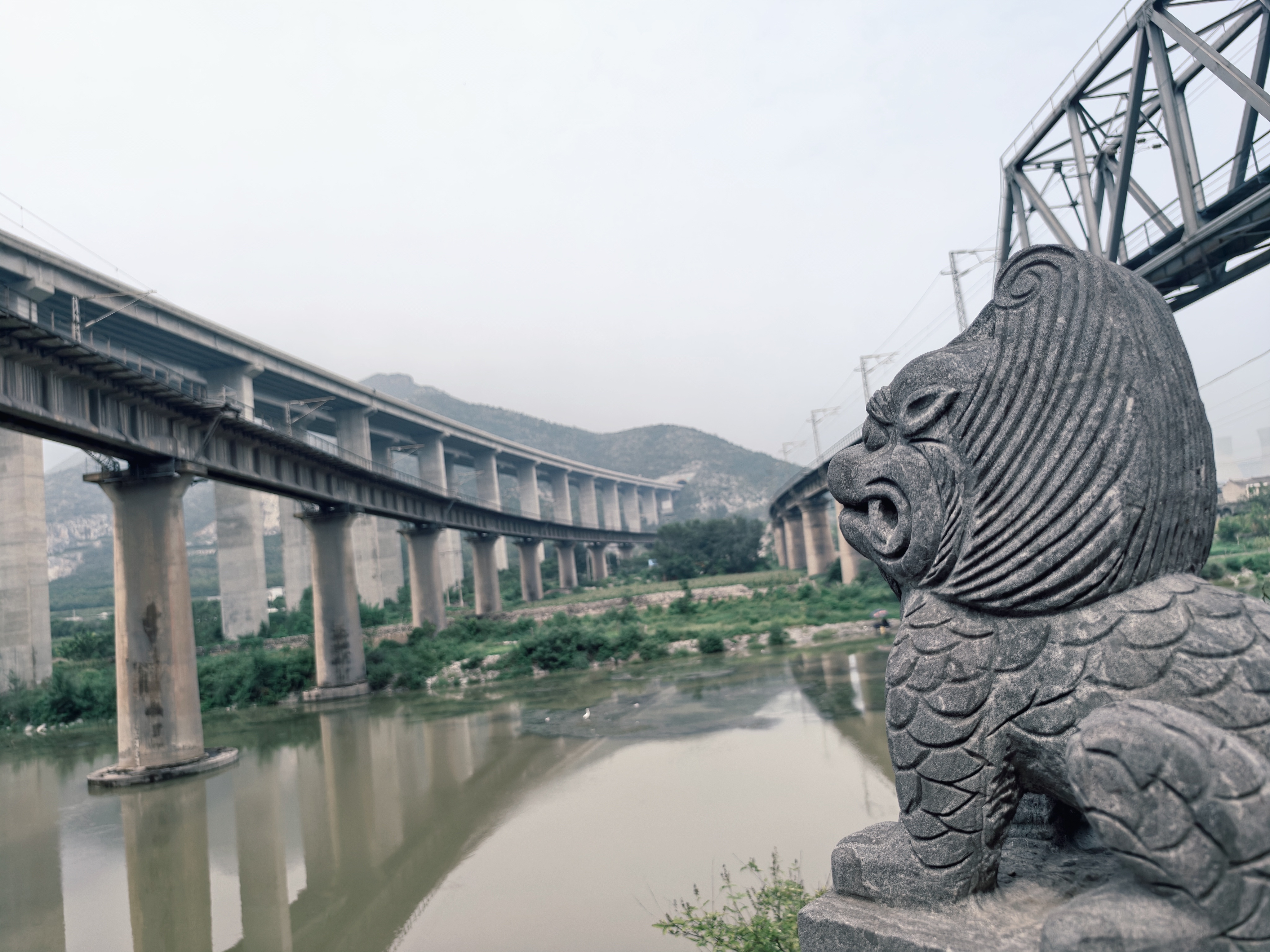 广利渠渠首的石兽与现代高架桥咫尺相望。(宋向乐 摄)