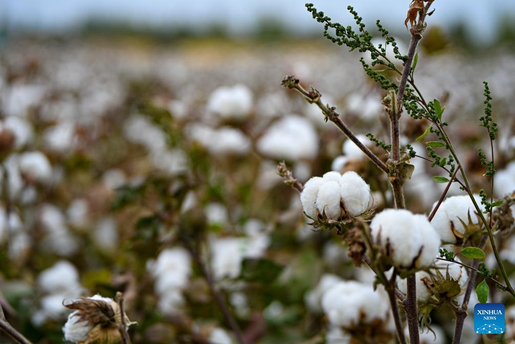 This photo shows cotton grown in Daxi Village of Yuli County, Mongolian Autonomous Prefecture of Bayingolin, northwest China's Xinjiang Uygur Autonomous Region, Sept. 19, 2025. People in Daxi Village of Yuli County used to live a poor life due to the harsh natural environment and limited means of living. In recent years, local authorities have made efforts to develop tourism and e-commerce to promote rural development, which has brought more income for local villagers. (Xinhua/Chen Shuo)
