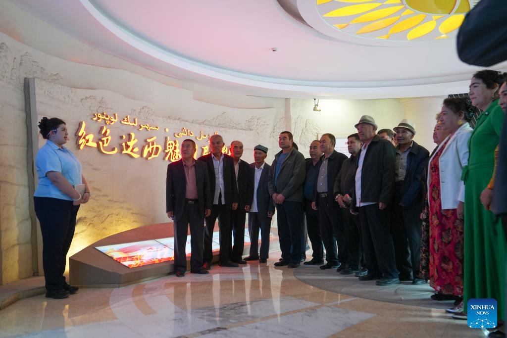 Tourists visit an exhibition hall in Daxi Village of Yuli County, Mongolian Autonomous Prefecture of Bayingolin, northwest China's Xinjiang Uygur Autonomous Region, Sept. 19, 2025. People in Daxi Village of Yuli County used to live a poor life due to the harsh natural environment and limited means of living. In recent years, local authorities have made efforts to develop tourism and e-commerce to promote rural development, which has brought more income for local villagers. (Xinhua/Jiang Wenyao)