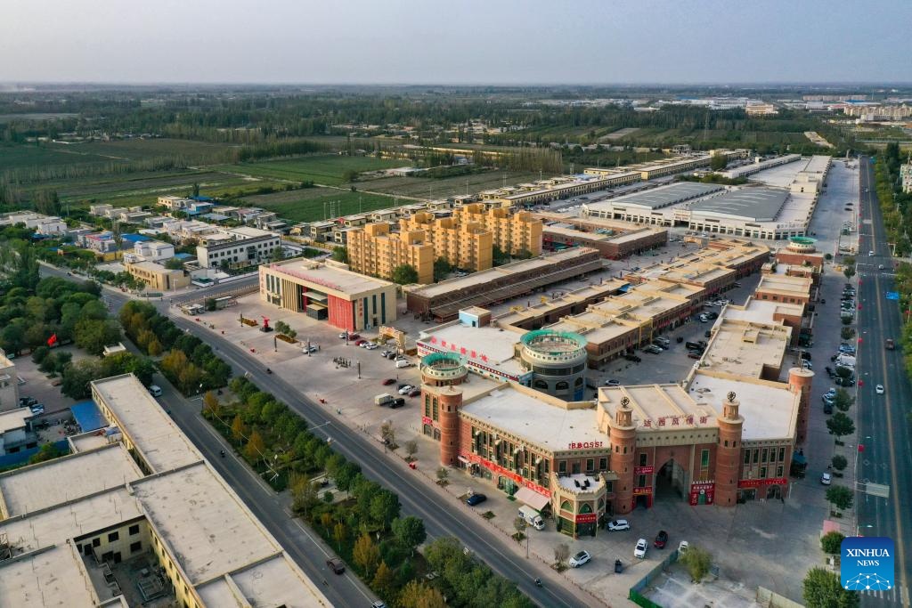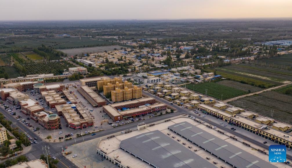 An aerial drone photo shows Daxi Village of Yuli County, Mongolian Autonomous Prefecture of Bayingolin, northwest China's Xinjiang Uygur Autonomous Region, Sept. 18, 2025. People in Daxi Village of Yuli County used to live a poor life due to the harsh natural environment and limited means of living. In recent years, local authorities have made efforts to develop tourism and e-commerce to promote rural development, which has brought more income for local villagers. (Xinhua/Chen Shuo)