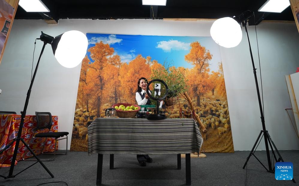 A villager promotes local agricultural products via live streaming at an e-commerce base in Daxi Village of Yuli County, Mongolian Autonomous Prefecture of Bayingolin, northwest China's Xinjiang Uygur Autonomous Region, Sept. 19, 2025. People in Daxi Village of Yuli County used to live a poor life due to the harsh natural environment and limited means of living. In recent years, local authorities have made efforts to develop tourism and e-commerce to promote rural development, which has brought more income for local villagers. (Xinhua/Lu Ye)
