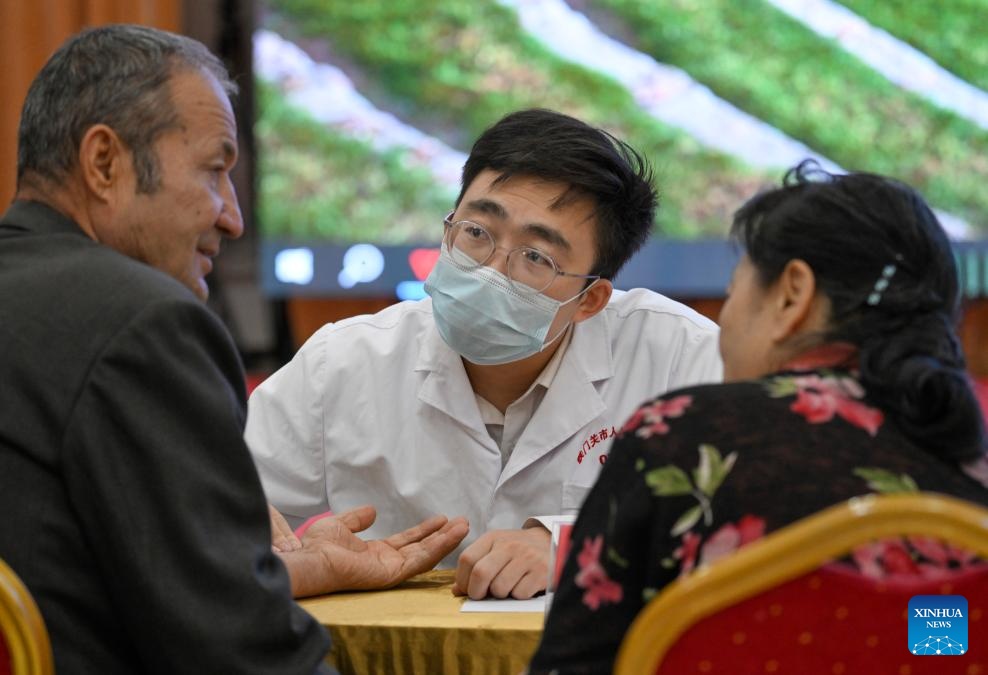 A doctor from Tiemenguan City conducts free clinical treatment to a local villager in Daxi Village of Yuli County, Mongolian Autonomous Prefecture of Bayingolin, northwest China's Xinjiang Uygur Autonomous Region, Sept. 19, 2025. People in Daxi Village of Yuli County used to live a poor life due to the harsh natural environment and limited means of living. In recent years, local authorities have made efforts to develop tourism and e-commerce to promote rural development, which has brought more income for local villagers. (Xinhua/Wang Fei)