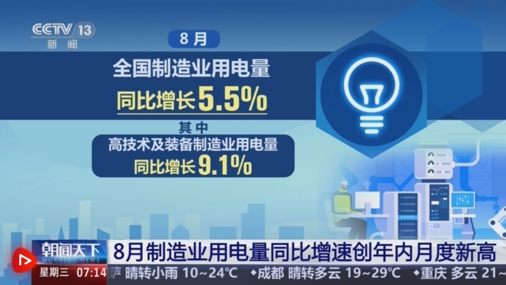 数据显示,8月,全国制造业用电量同比增长5.5%。其中,高技术及装备制造业用电量同比增长9.1%,增速高于制造业平均水平约4.6个百分点。