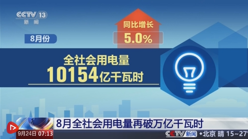 最新数据显示,8月份,全社会用电量10154亿千瓦时,同比增长5.0%。我国用电量已经连续两个月突破万亿。