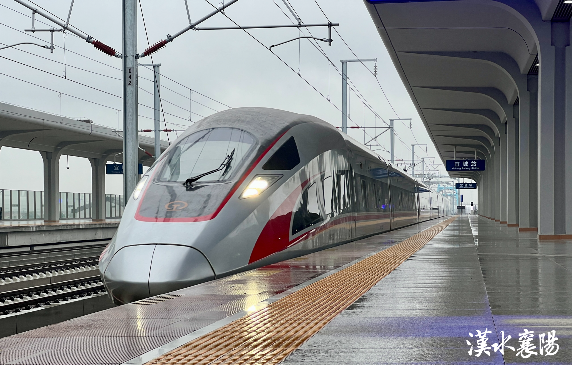▲襄荆高铁试运行动车组驶入宜城高铁站