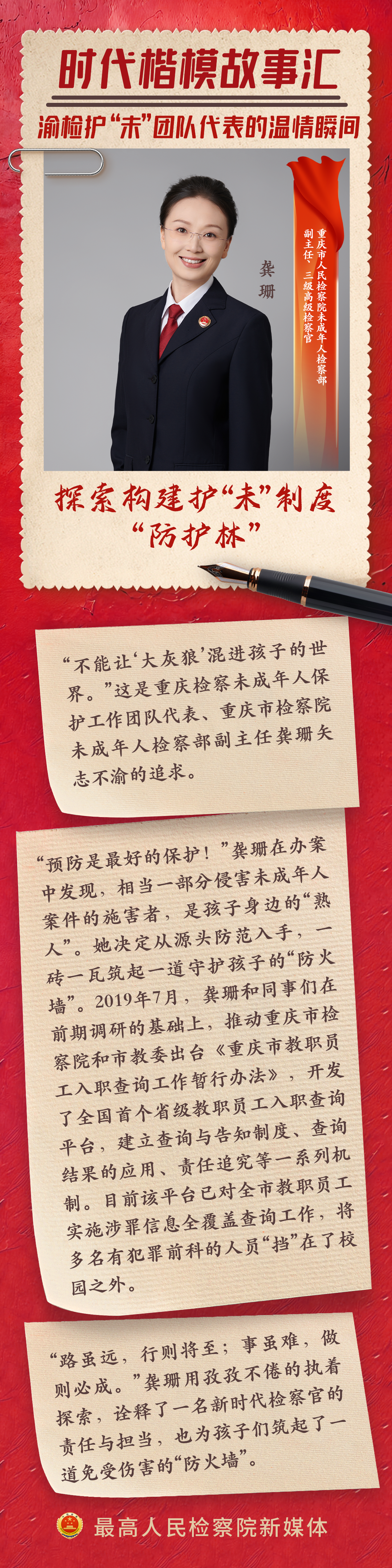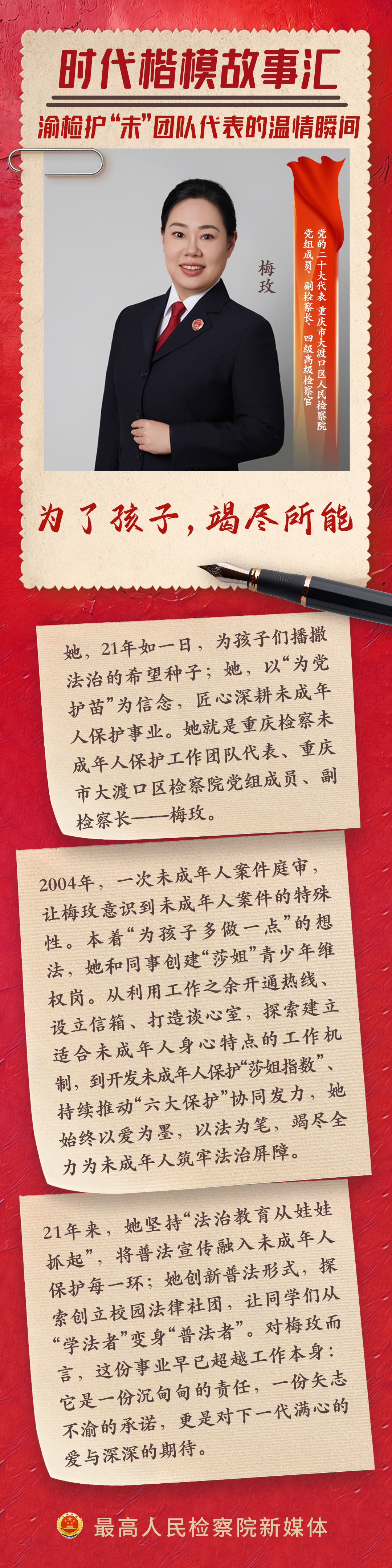 “守护孩子,就是守护未来”“为了孩子,所有的付出都是值得的”……日前,中央宣传部授予重庆检察未成年人保护工作团队代表(简称“渝检护‘未’团队代表”)“时代楷模”称号,褒扬他们是“德法相伴、倾情守护未成年人健康成长的典范”。