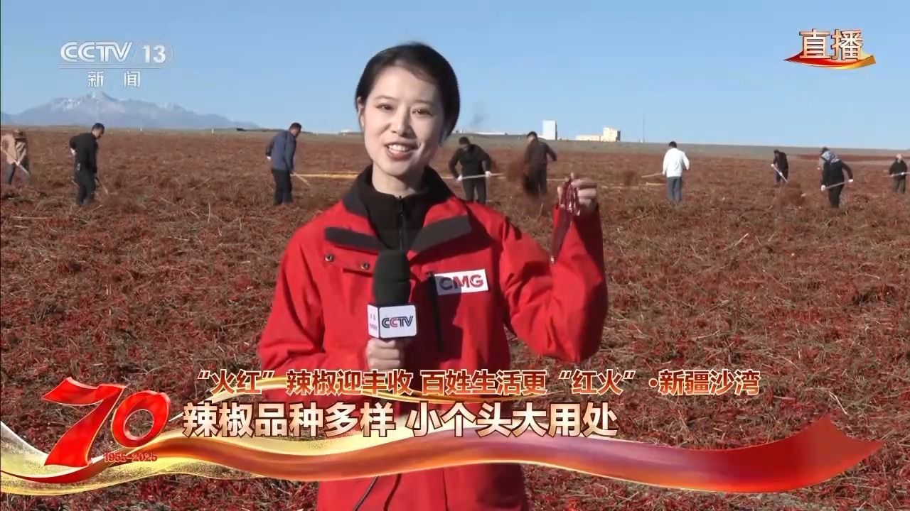 总台央视记者张丛婧:我现在就在新疆沙湾市安集海镇的万亩戈壁晾晒场上,村民们正在晾晒刚采收的辣椒,阳光一照,浓郁的辣香扑鼻而来。