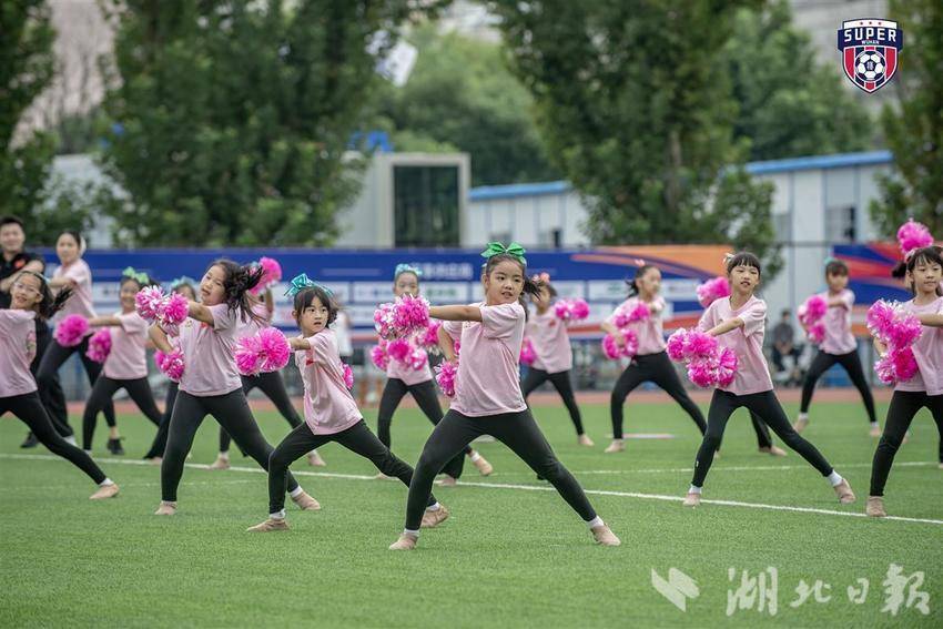开球前,来自华科附属小学的足球宝贝们跳起欢快的舞蹈为比赛助兴。