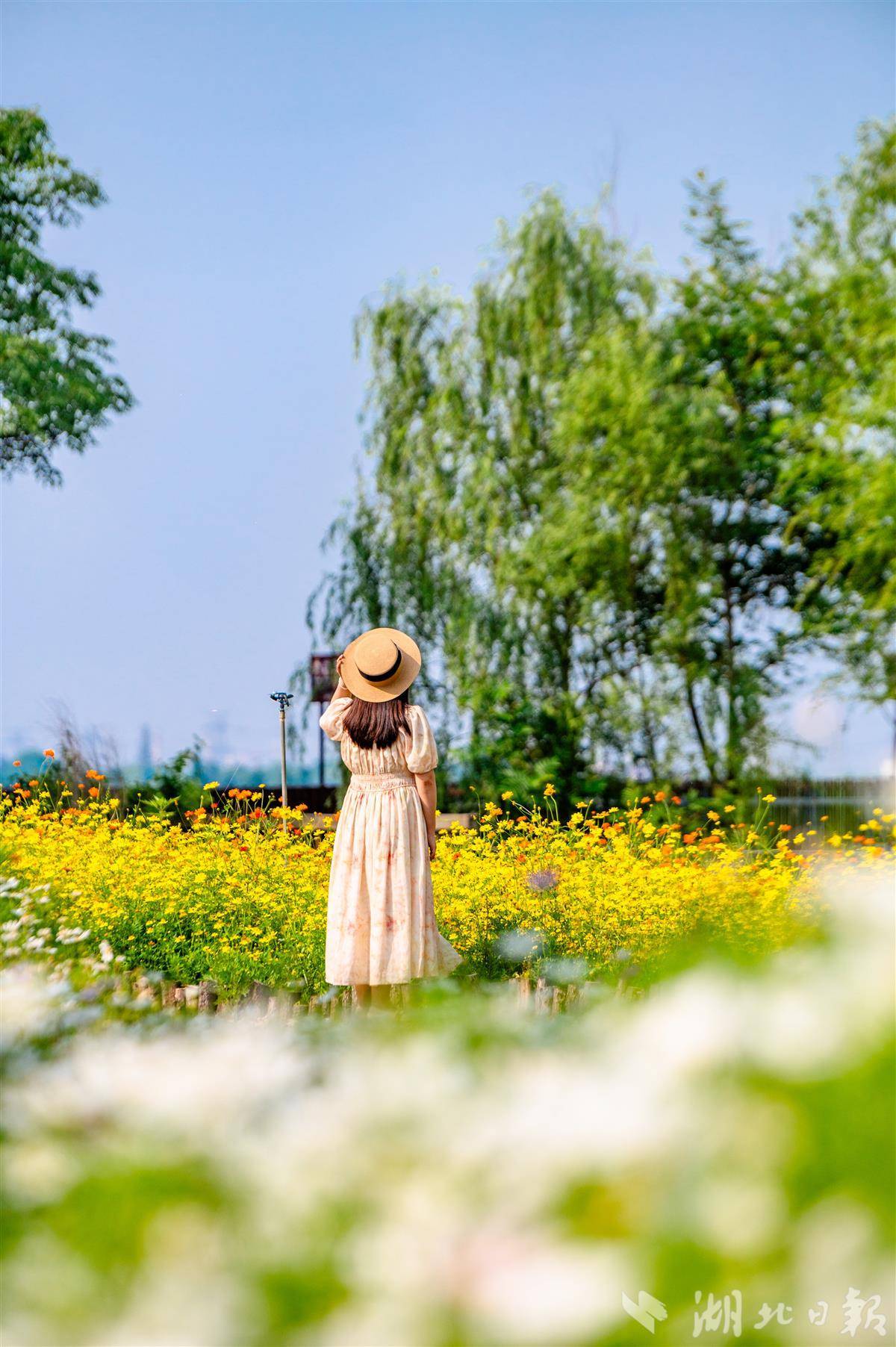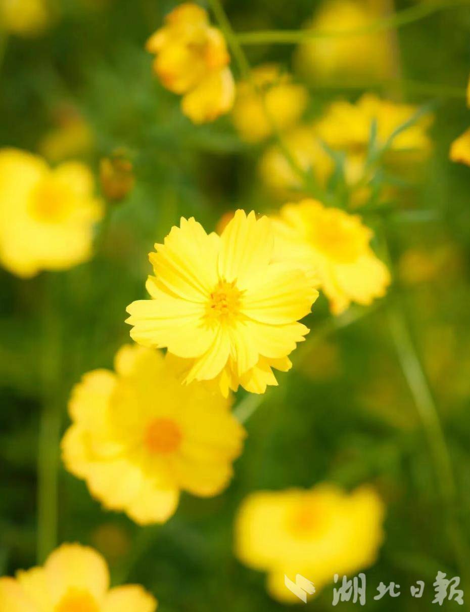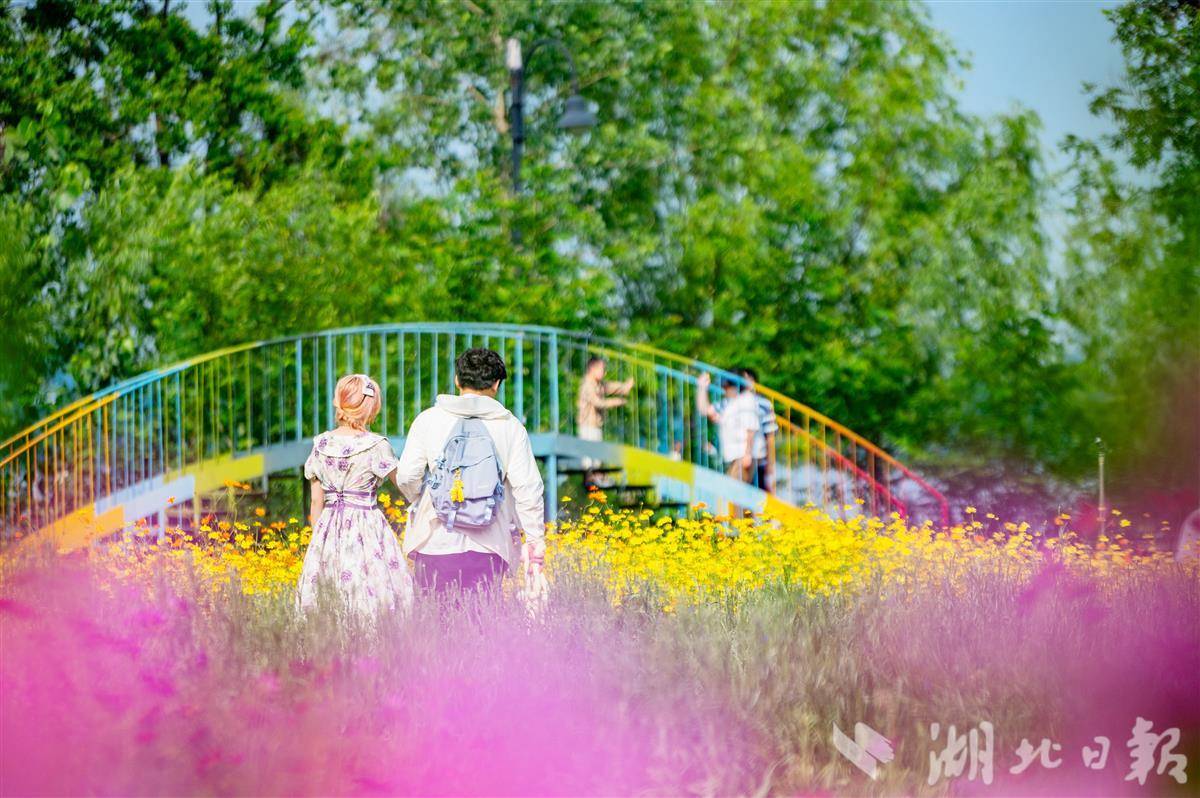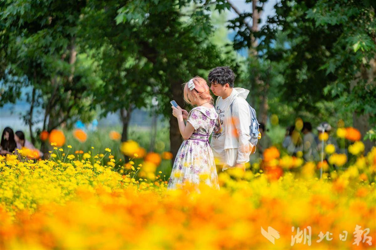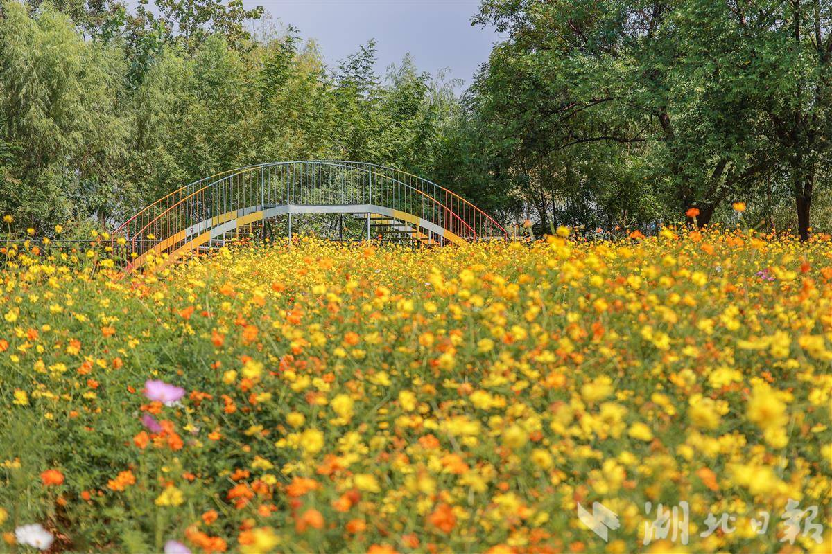 5000平方米的湖光花海正值盛花期,硫华菊与百日草交织成缤纷海洋。