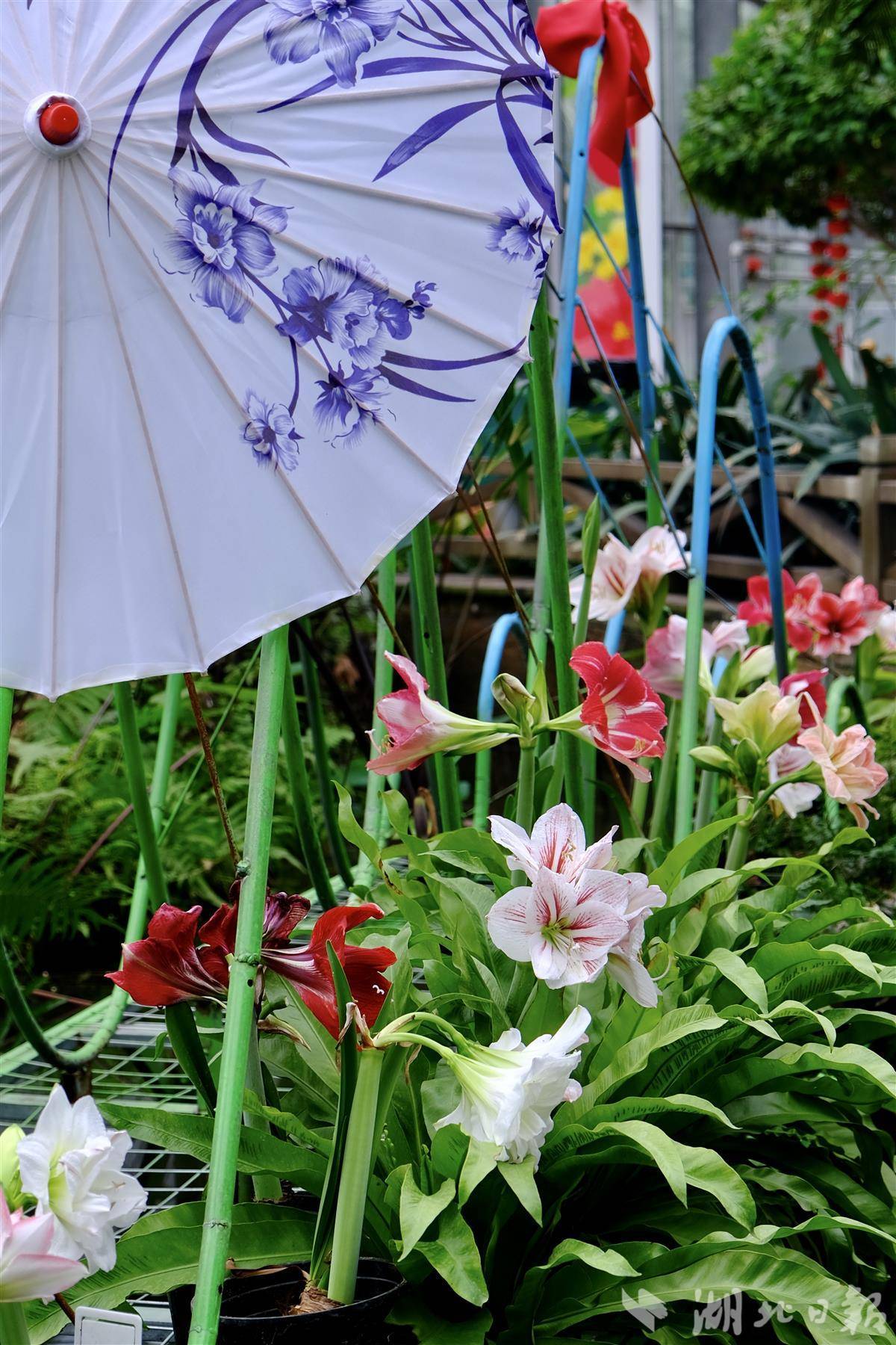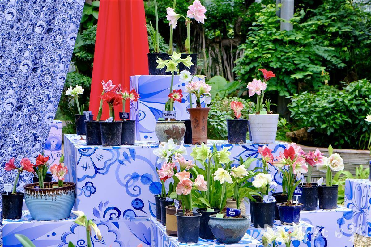 园艺师将朱顶红与青花瓷纹样元素相结合,用现代展陈方式演绎传统美学。