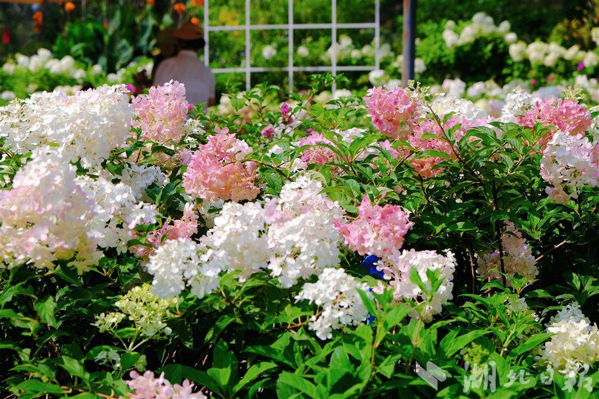 目前圆锥绣球呈现的是清新浪漫的奶油白和浅绿色,国庆假期昼夜温差变大,可能会让变色过程加速上演,游客有望目睹圆锥绣球从清新淡雅到浓墨重彩的渐变过程,届时将非常有视觉冲击力。“可能今天还是小清新,明天就变成复古港风了。”武汉植物园园艺师介绍,圆锥绣球展将持续至11月中下旬,不同时间来可以解锁不一样的赏花体验。