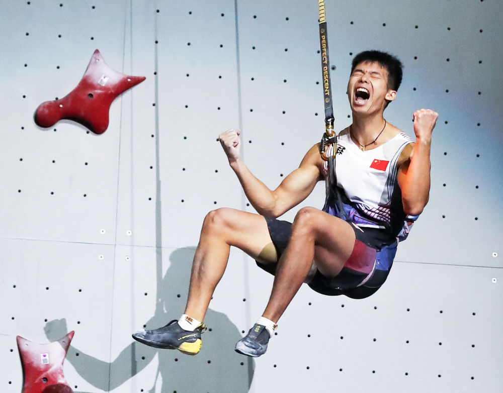 9月25日,中国选手龙见国在夺冠后庆祝。新华社记者 姚琪琳 摄