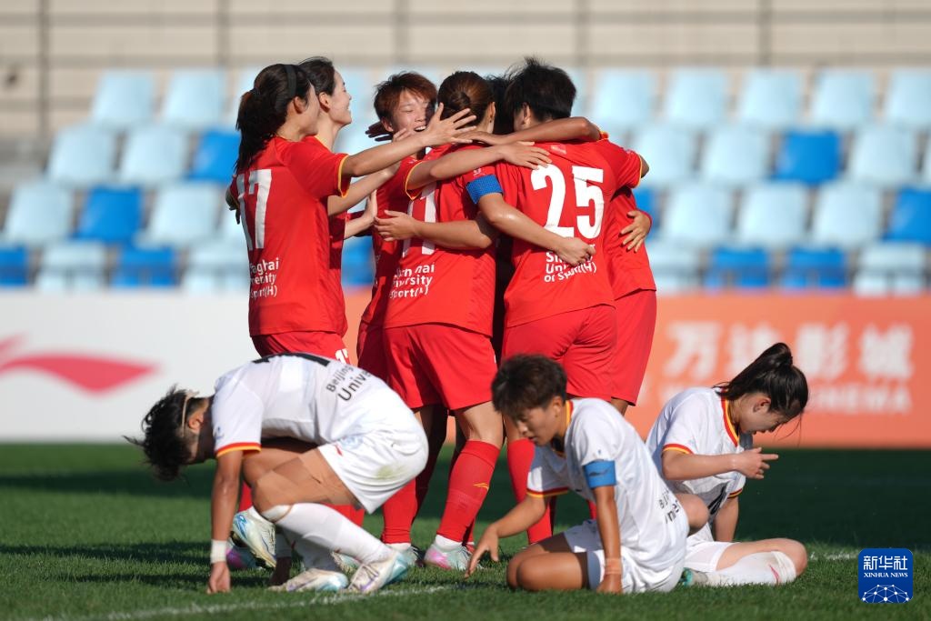9月25日,上海体育大学女足球员在赛后庆祝胜利。