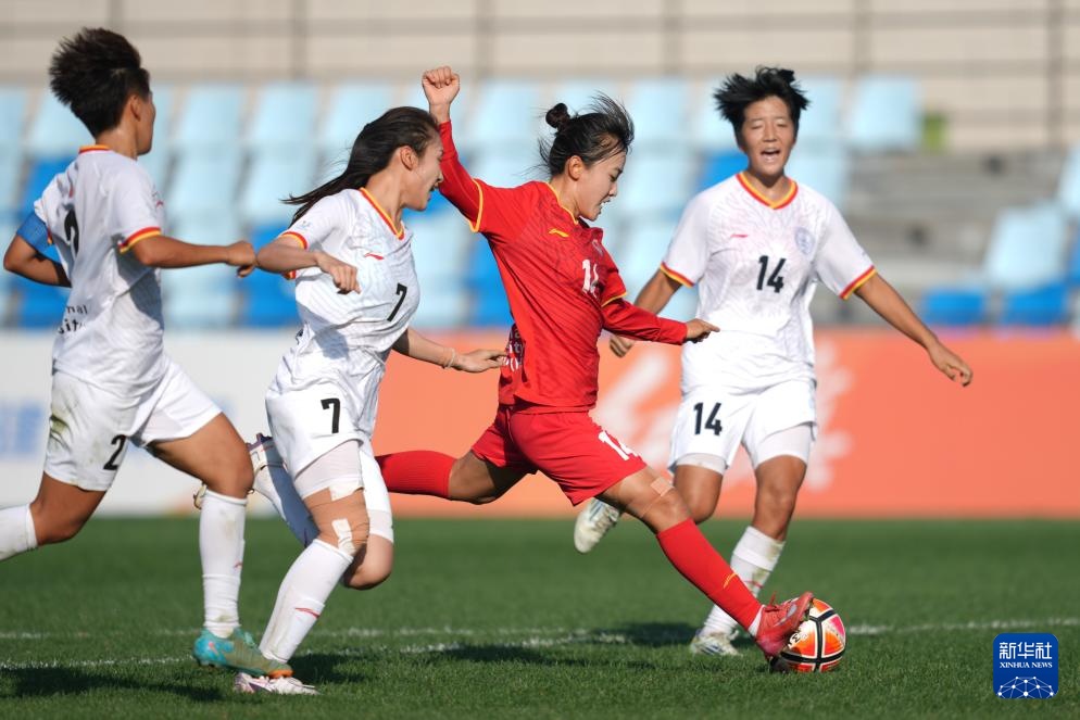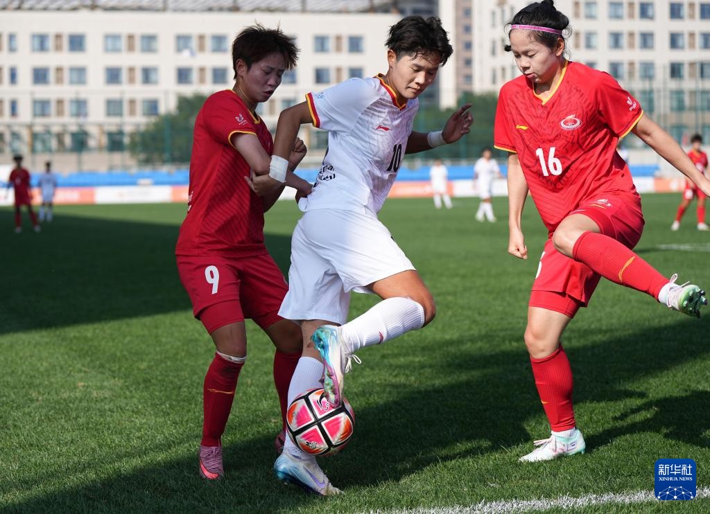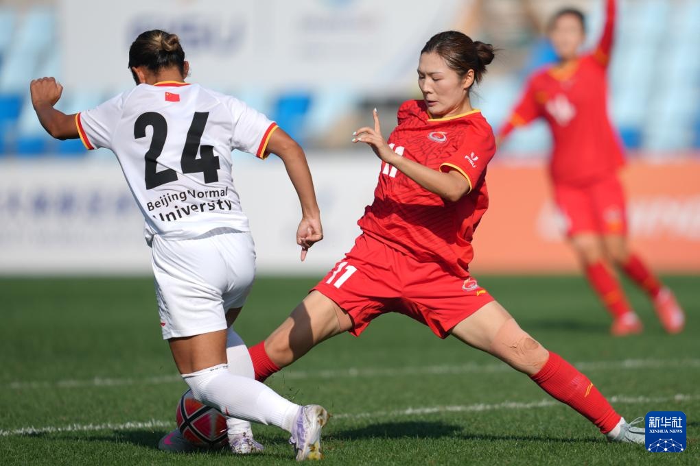 9月25日,北京师范大学女足球员周心雨(中)在比赛中。