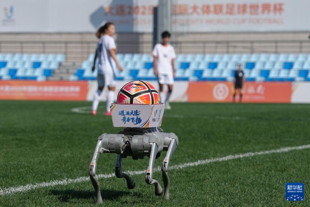 9月25日,机器狗在赛前将比赛用球带入场地。