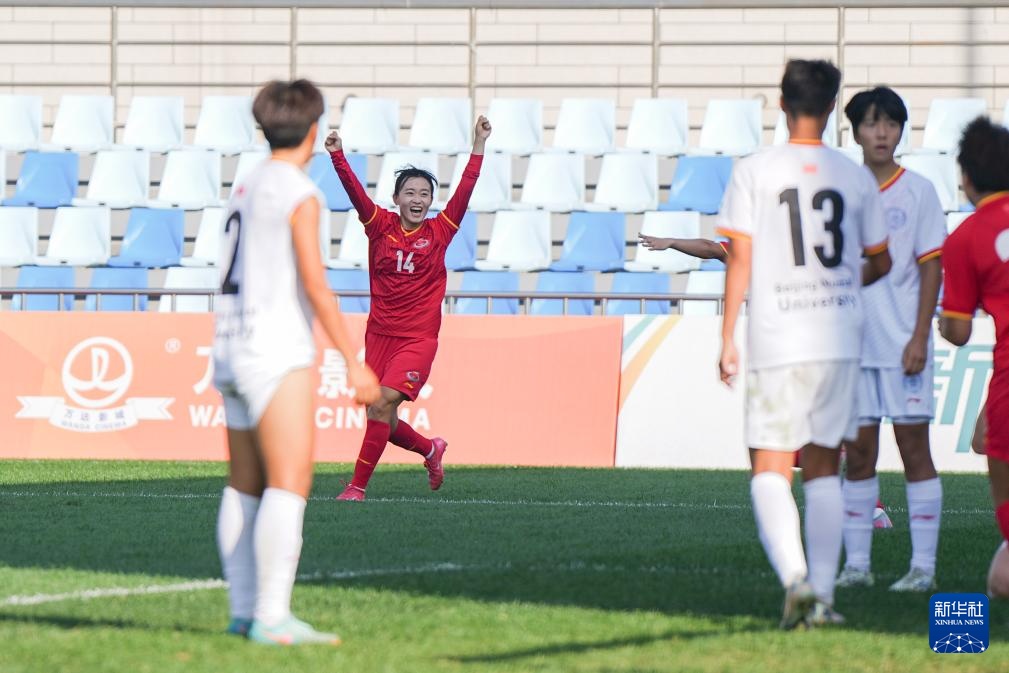9月25日,上海体育大学女足球员在比赛中庆祝进球。