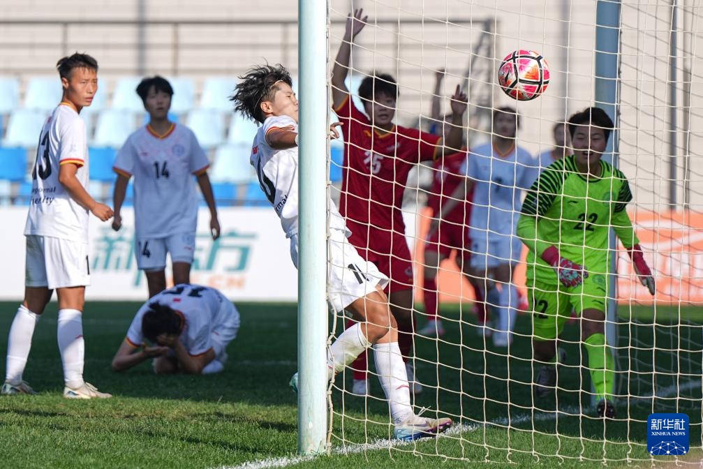 9月25日,北京师范大学女足球员周心雨(前左)、守门员梅璟艳(前右)未能扑出对方球员的进球。