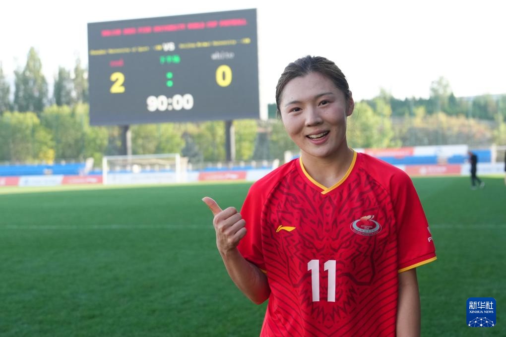 9月25日,上海体育大学女足球员孙方欣在赛后庆祝胜利。