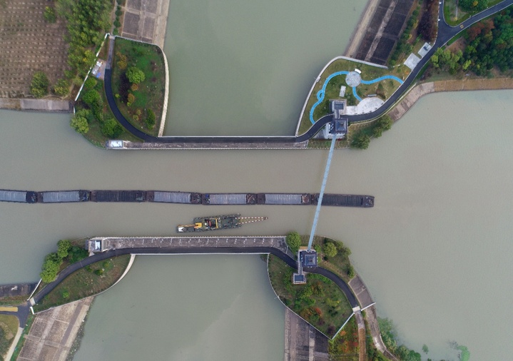 不远处的京杭大运河上,货船正驶过“上槽下洞”的水立交结构。“上面是南北走向的千年运河,下方是东西走向的淮河入海水道,这种结构能让行洪和航运互不干扰。”王洪玉指向泄水涵洞的方向,“原来每秒2270立方米的行洪流量,二期建成后要提升到7000立方米,洪泽湖的防洪标准也从百年一遇提至三百年一遇。”