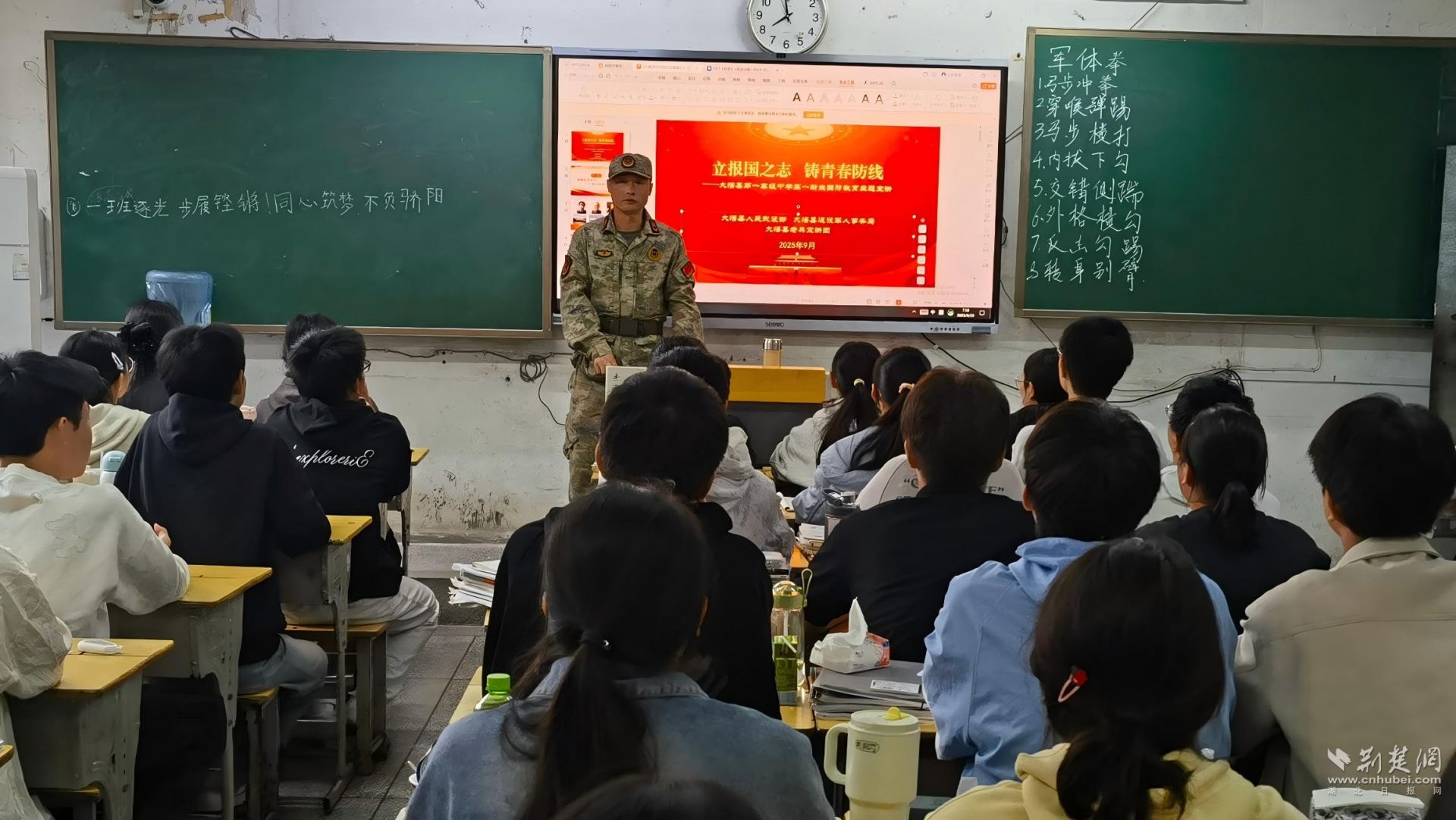 荆楚网(湖北日报网)讯(通讯员 徐壮)近日,大悟县第一高级中学高一年级新生军训周期间,一道由“迷彩绿”和“赤诚红”交织的风景线格外引人注目。由大悟县退役军人事务局联合县人武部组织,该县“老兵宣讲团”以军训教官的身份,将火热的训练场变为生动的国防教育课堂和红色基因传承地,为莘莘学子带来了一场震撼心灵的精神洗礼。