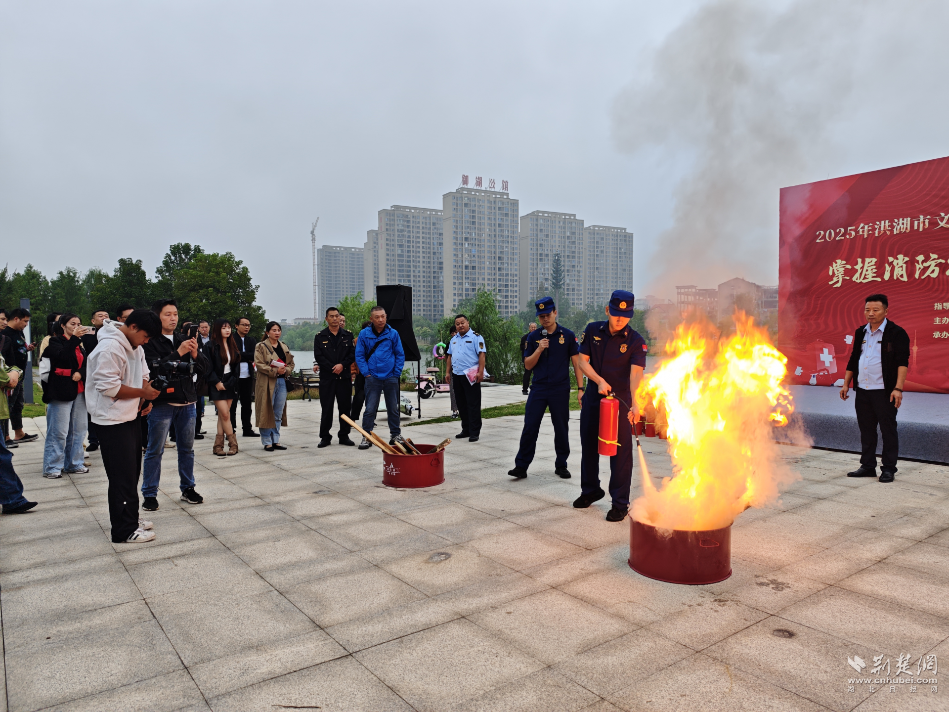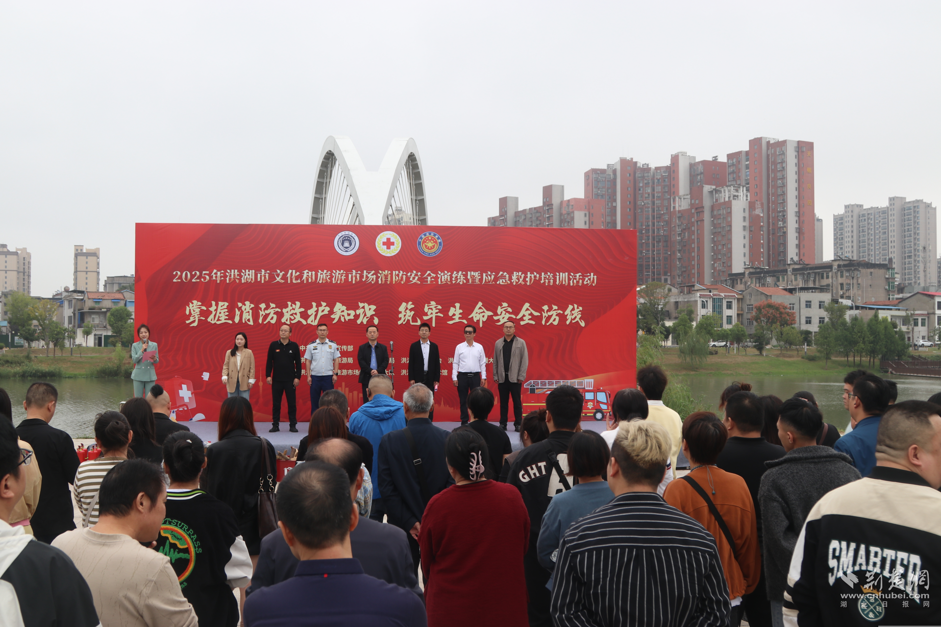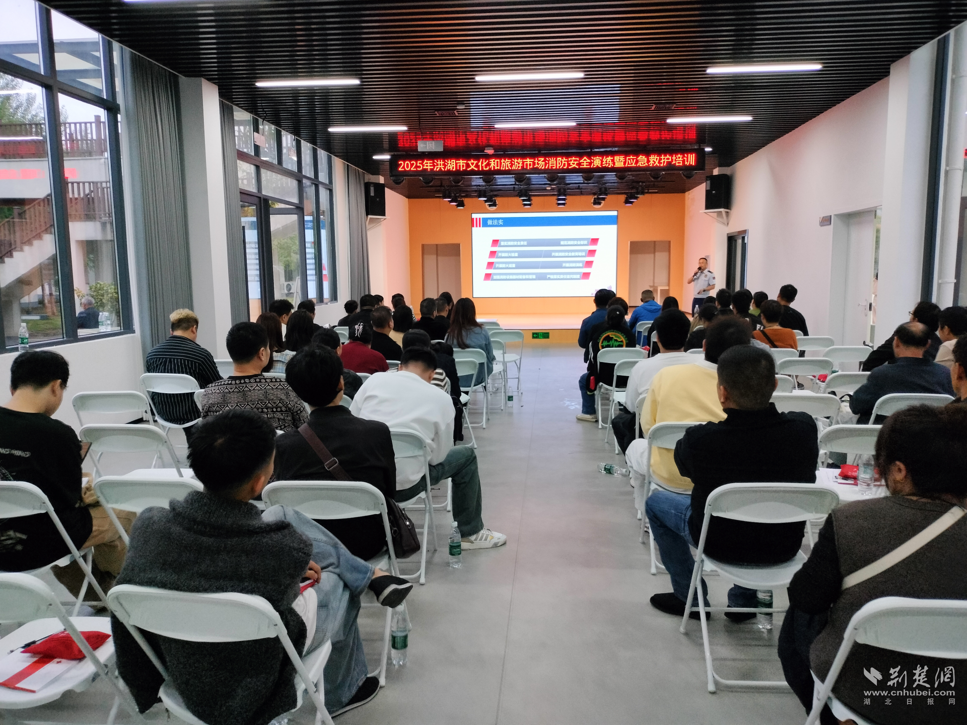 荆楚网(湖北日报网)讯(通讯员 毛富然)9月25日,在中秋、国庆即将来临的关键节点,洪湖市消防救援大队联合宣传、应急、文旅及市红十字会等部门,在市群众艺术馆开展文旅市场消防安全培训演练,以“理论+实操”培训精准筑牢假日安全防线,全市景区、影院、网吧、KTV、电竞酒店等文旅经营单位的负责人约100人参加了此次活动。