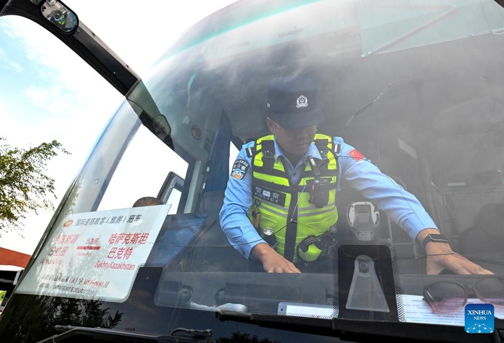 An immigration officer inspects an outbound bus for Kazakhstan at Bakti port in Tacheng, northwest China's Xinjiang Uygur Autonomous Region, Sept. 17, 2025. Xinjiang is seeing increased vitality across the board as the region accelerates its efforts to the construction of the New International Land-Sea Trade Corridor, a key logistics network connecting China's western regions to global markets.