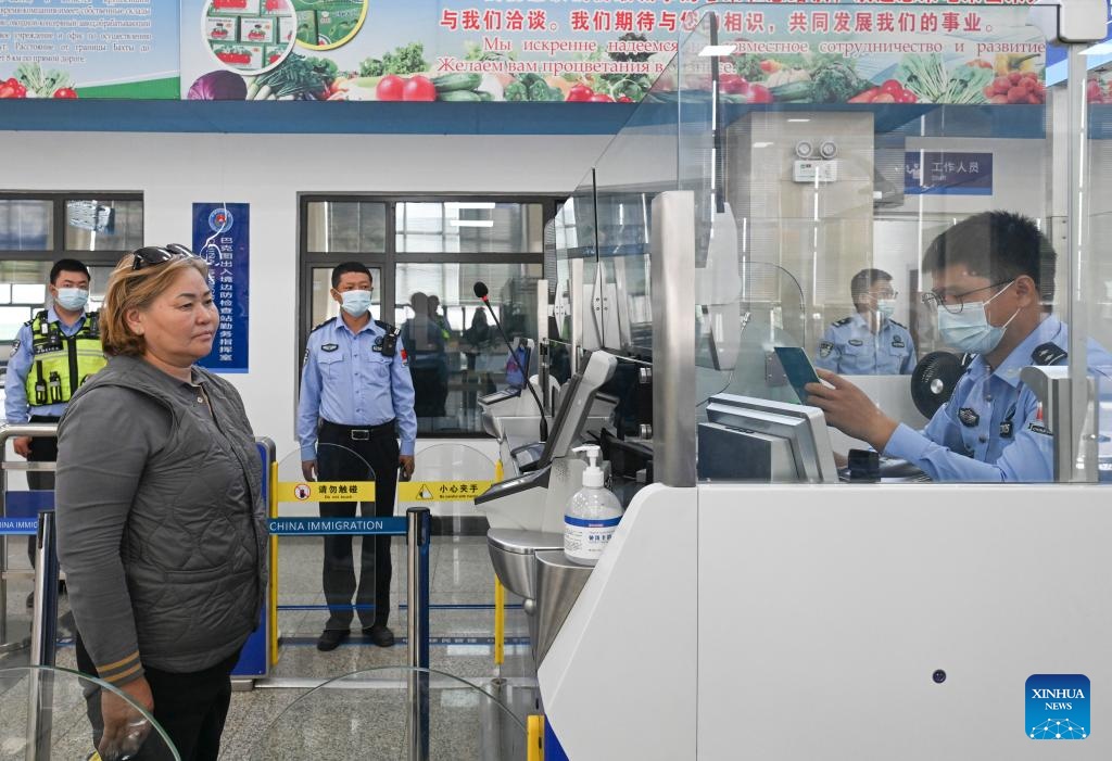 Passengers go through exit formalities at Bakti port in Tacheng, northwest China's Xinjiang Uygur Autonomous Region, Sept. 17, 2025. Xinjiang is seeing increased vitality across the board as the region accelerates its efforts to the construction of the New International Land-Sea Trade Corridor, a key logistics network connecting China's western regions to global markets.