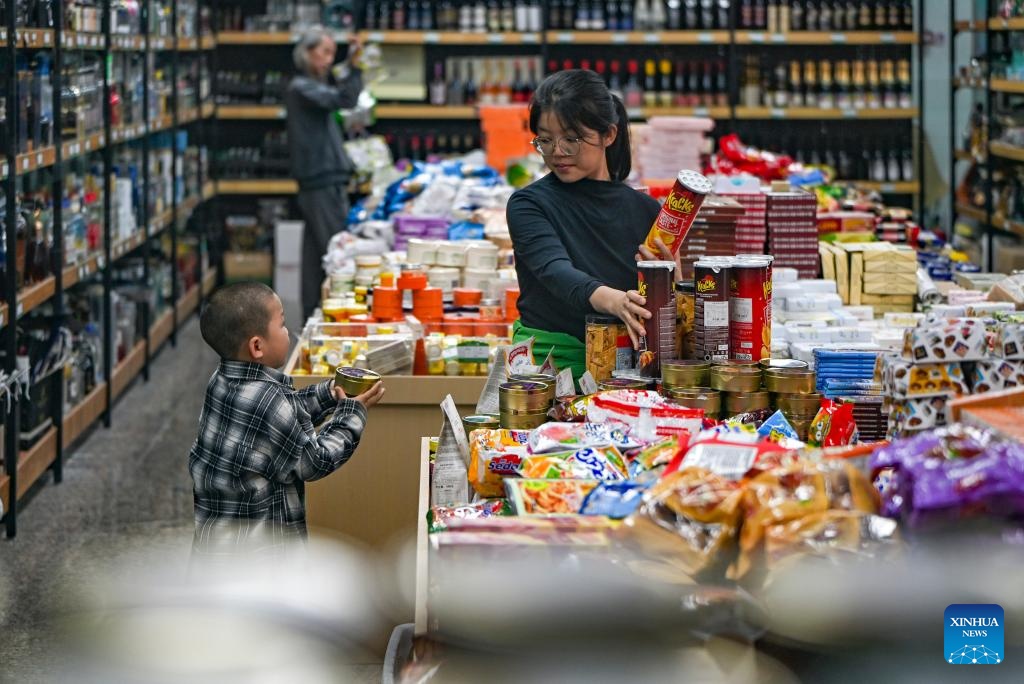 Tourists select commodities at a border trade center near Bakti port in Tacheng, northwest China's Xinjiang Uygur Autonomous Region, Sept. 17, 2025. Xinjiang is seeing increased vitality across the board as the region accelerates its efforts to the construction of the New International Land-Sea Trade Corridor, a key logistics network connecting China's western regions to global markets.