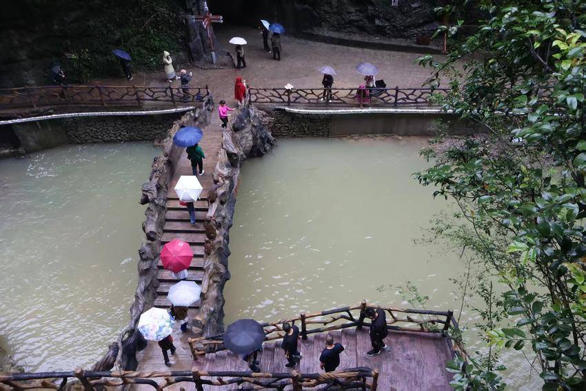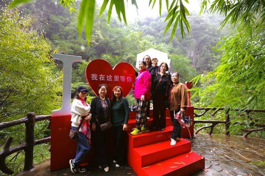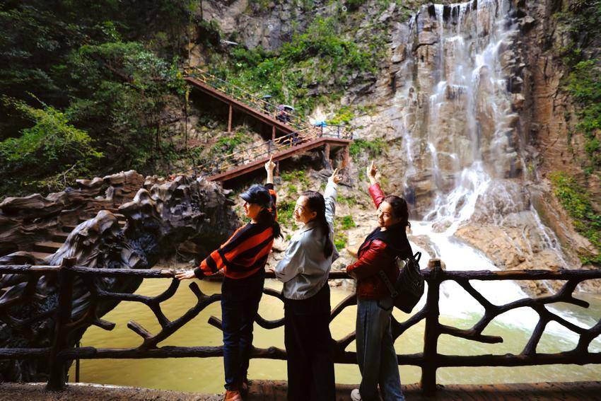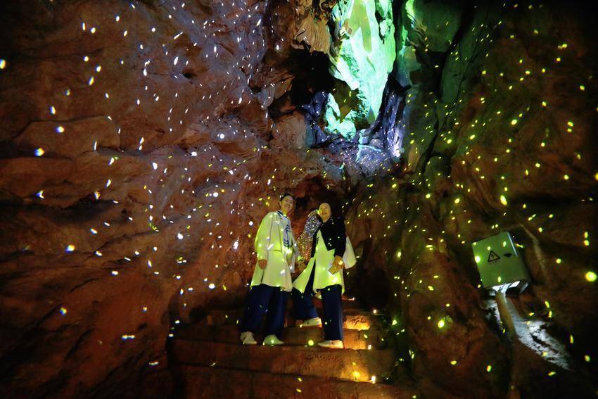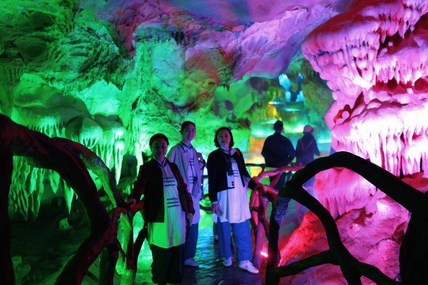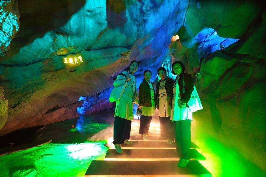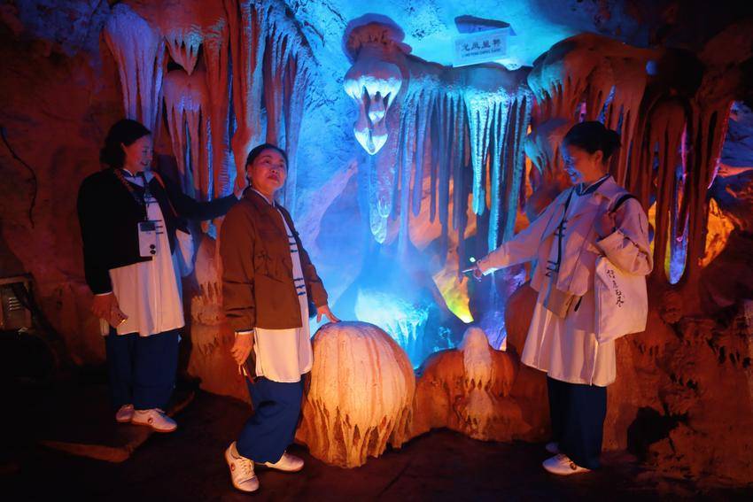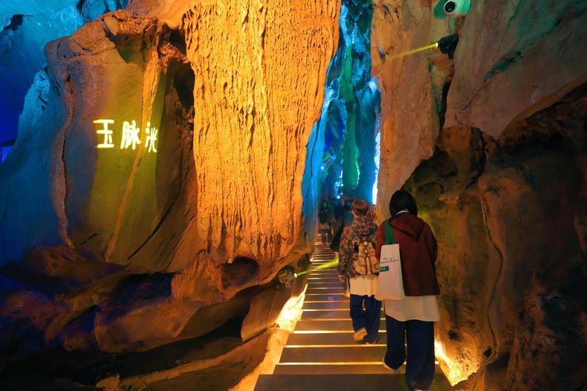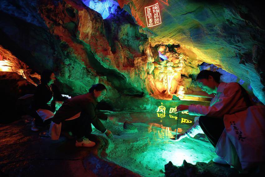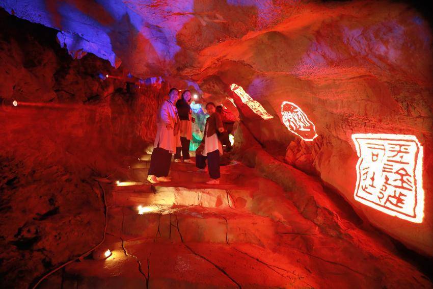 景区内,“卞和献玉”浮雕栩栩如生、荆玉桥古色古香、玉女瀑引人入胜、抱玉岩奇石丛生……溶洞内的灯光更是营造出如梦似幻的视觉盛宴,令人沉浸于光、影、水的交响诗中。游客们赞叹不已,在各个景点纷纷拍照打卡留影。